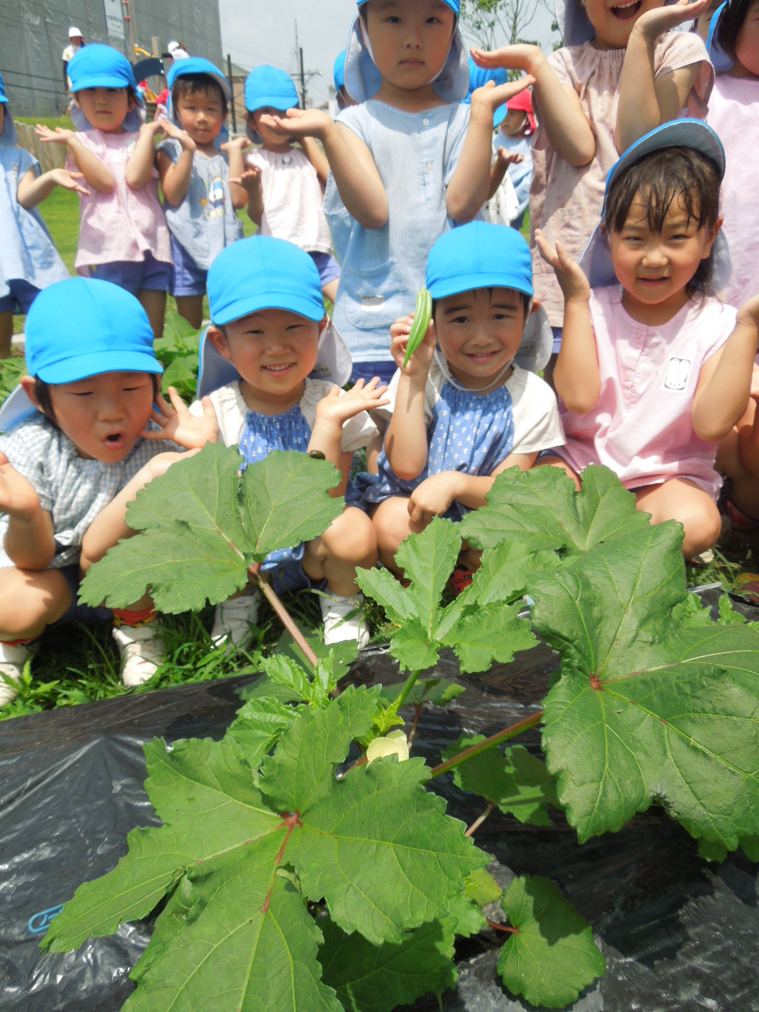 待ちに待ったオクラが1本大きくなっていました。早速みんなで収穫!