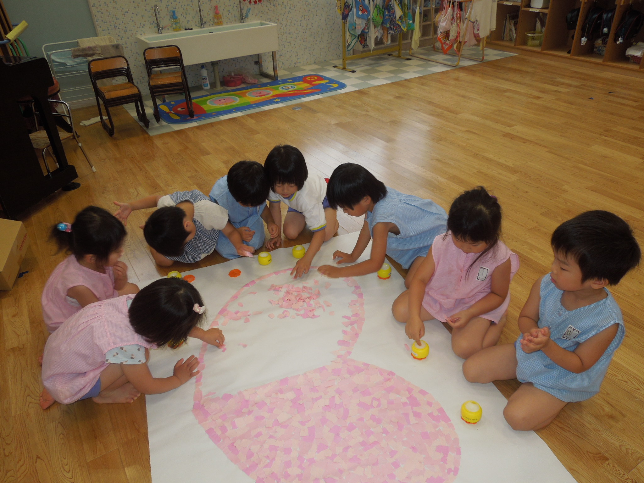 みんなで協力して大きなハートを製作中!7月に三木市消防本部に見学に行くときのプレゼントを一生懸命作っています。消防士さん喜んでくれるといいなぁ(*^_^*)