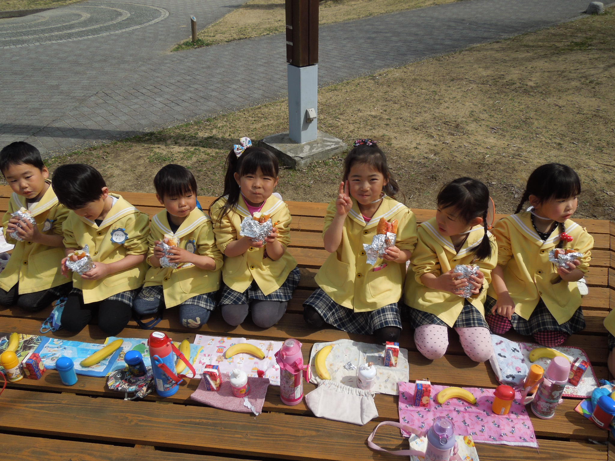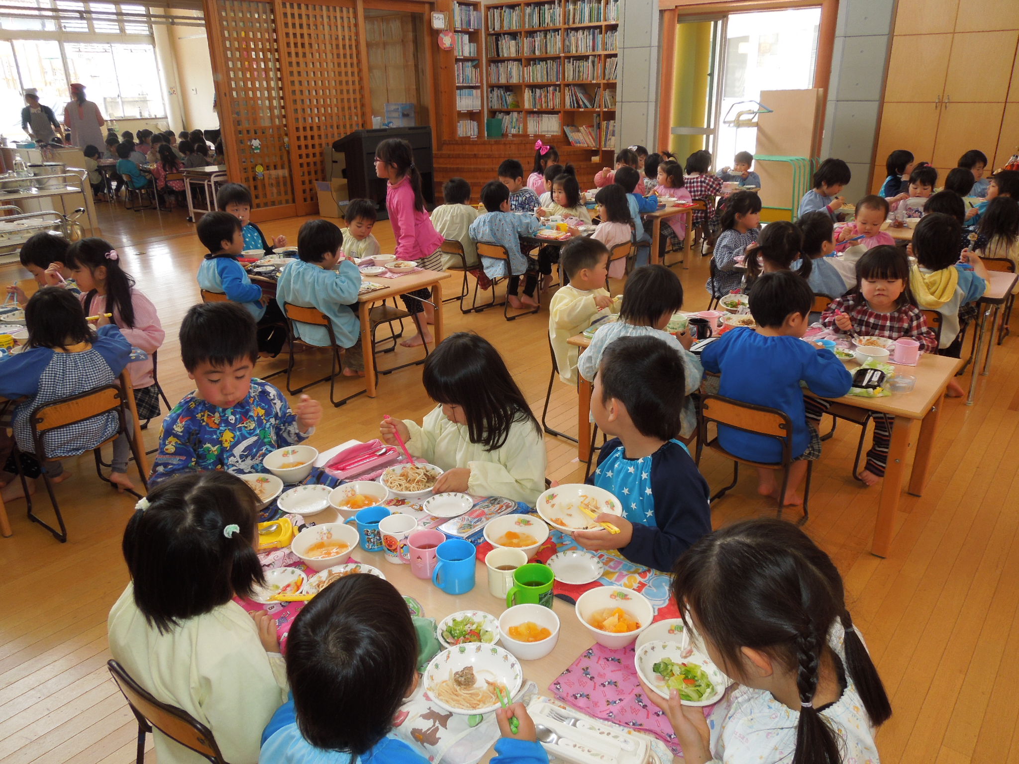 給食は、みんなで会食をしました。小さいお友だちのお手伝いをする大きいクラスのお友だち、とても頼もしい姿でした。お別れするのは寂しいけれど、新しい生活には楽しみがいっぱい!いままでたくさん遊んでくれてありがとう!!これからもみんながんばろうね♪