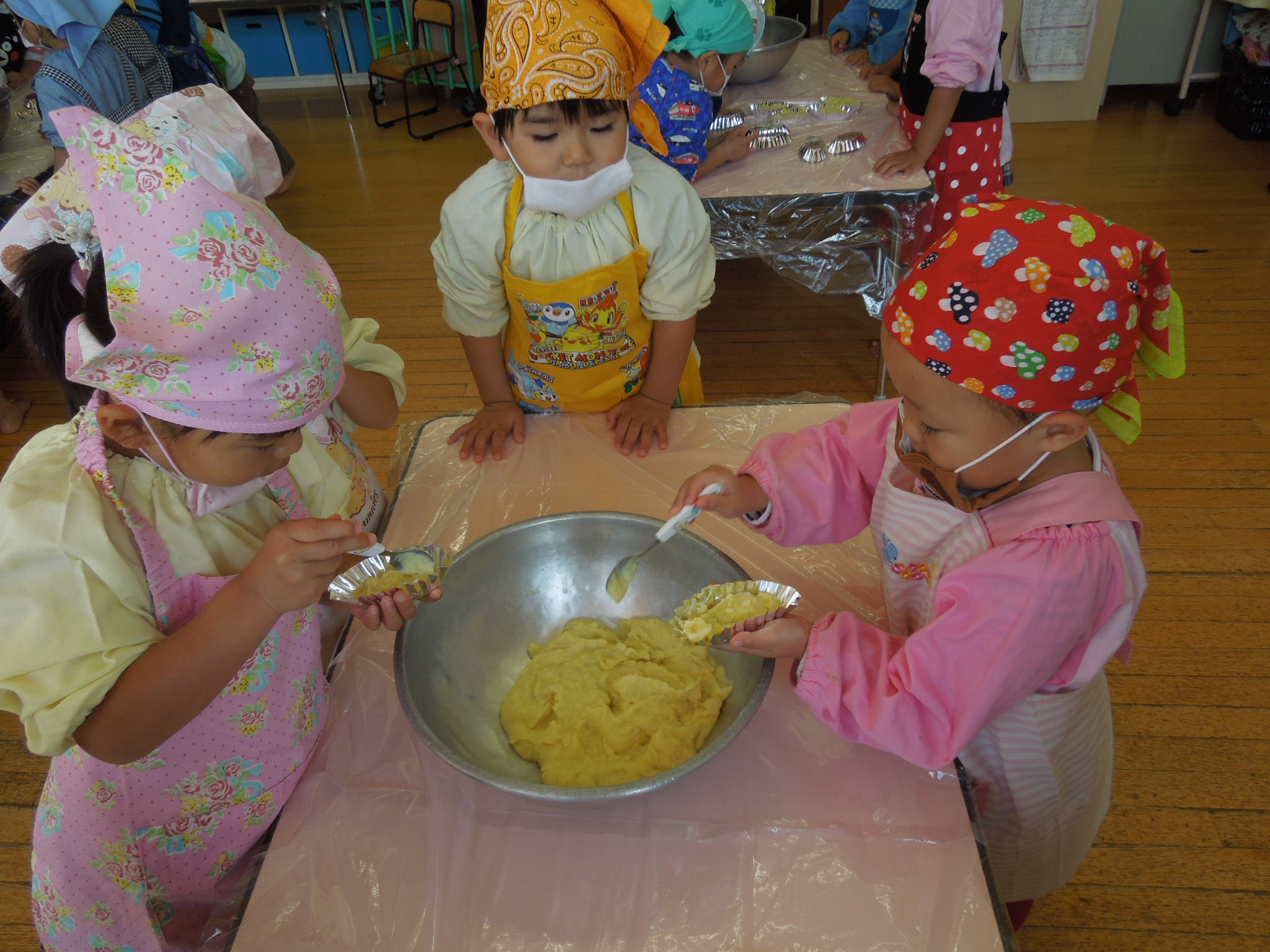 芋掘り大会で掘ったさつま芋を使って、クッキングをしました。お芋を潰し、バター・砂糖・生クリーム混ぜ、型に入れて、卵をぬってと、みんなで協力してスイートポテトを作りました。給食の先生に焼いて頂いて、3時のおやつにみんなで食べました。自分たちで作ったおやつは最高においしいです!!