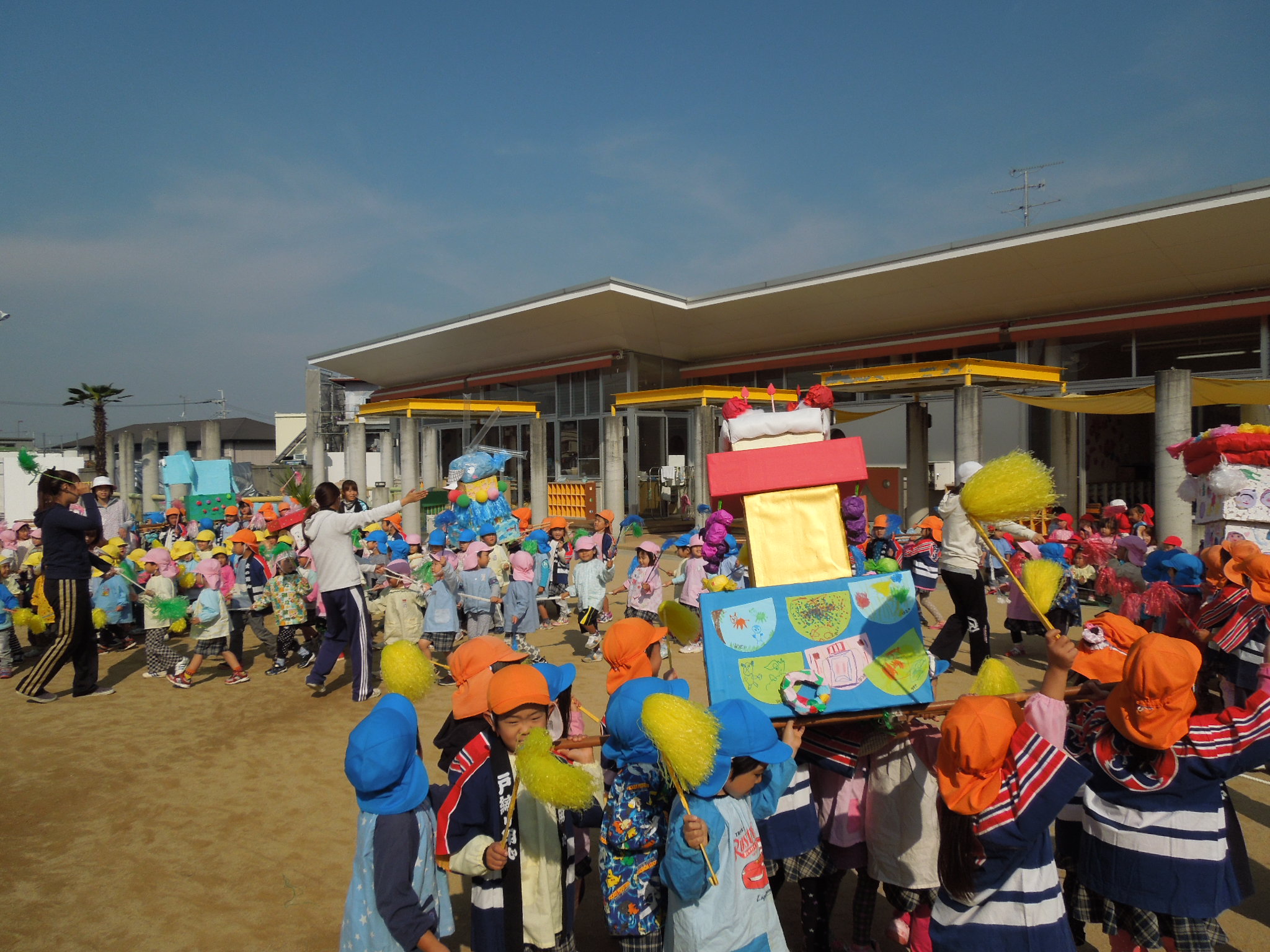 待ちに待ったおまつりごっこの日がやってきました。ぶどうの日のグループ活動で作った太鼓を披露し、担ぎ上げました!「よいやさ〜」「ドンデドン」と運動場を練り歩きます。保育園はまだまだお祭り気分が続きそうです!