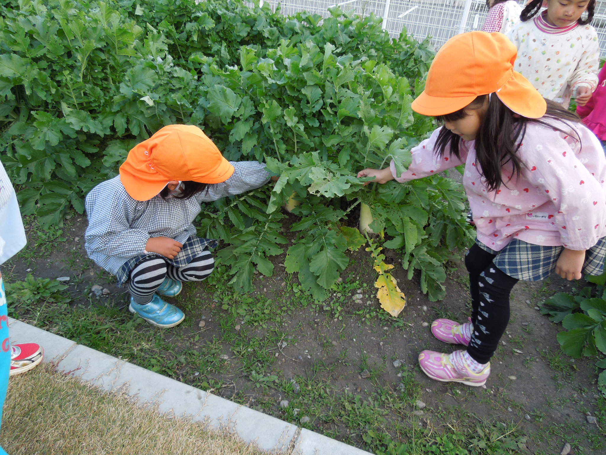 大根がとっても大きくなりました!!もうすぐ収穫!「どうやって抜こうかな?」今からとっても楽しみですね。