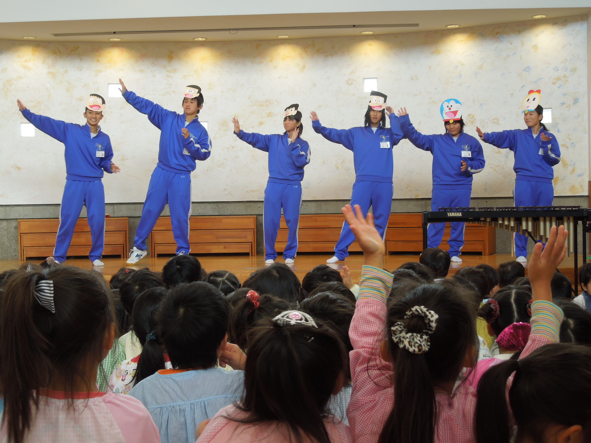 11月12日(月)〜16日(金)の間、トライやるウィークで、三木東中学校の2年生のお兄さん・お姉さん6名が、職場体験にきてくれています。今日は、中学生主催のお楽しみ会でした。自分たちで考えたドラえもんの劇や合奏、ダンスを披露してくれました。子どもたちも大喜びでしたね♪今回の6名は、みなさんえびす保育園の卒園児さんです。とても立派に成長され、うれしく思います。