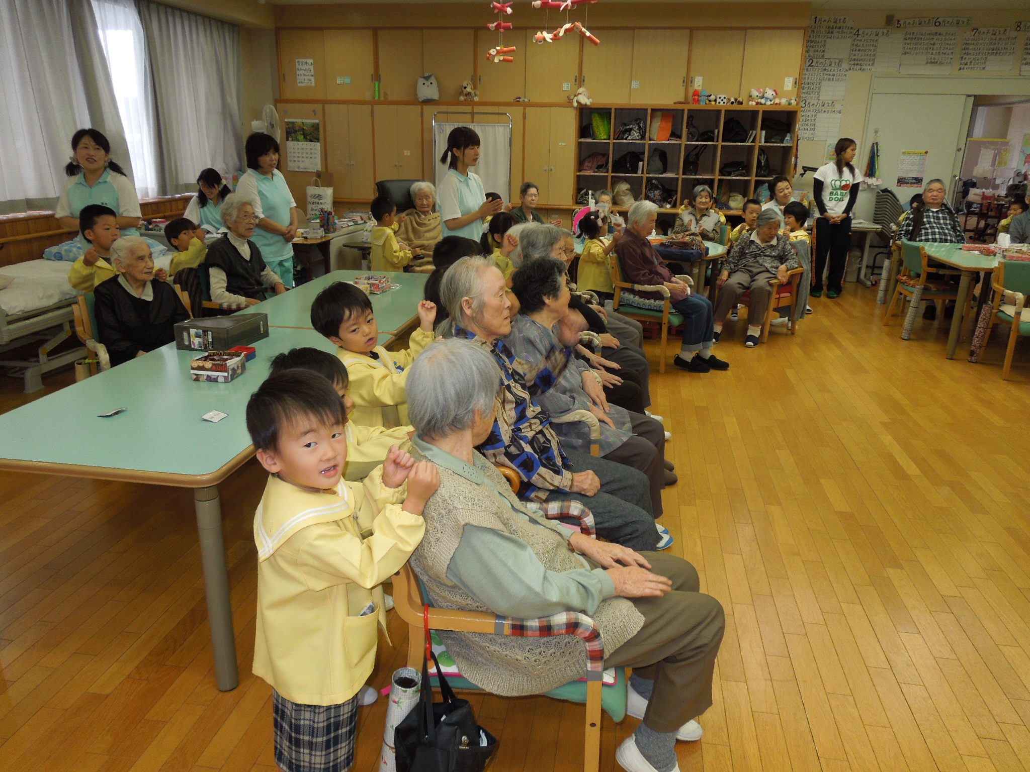 デイサービス三木東の皆さんのご招待を受け、誕生会に参加させて頂きました。みんなの元気な歌声を聴かせてあげようと、秋の歌や手遊びなどを披露しました。「かわいいな〜」「じょうずやね〜」とたくさんかわいがって頂き、子どもたちも大喜び!