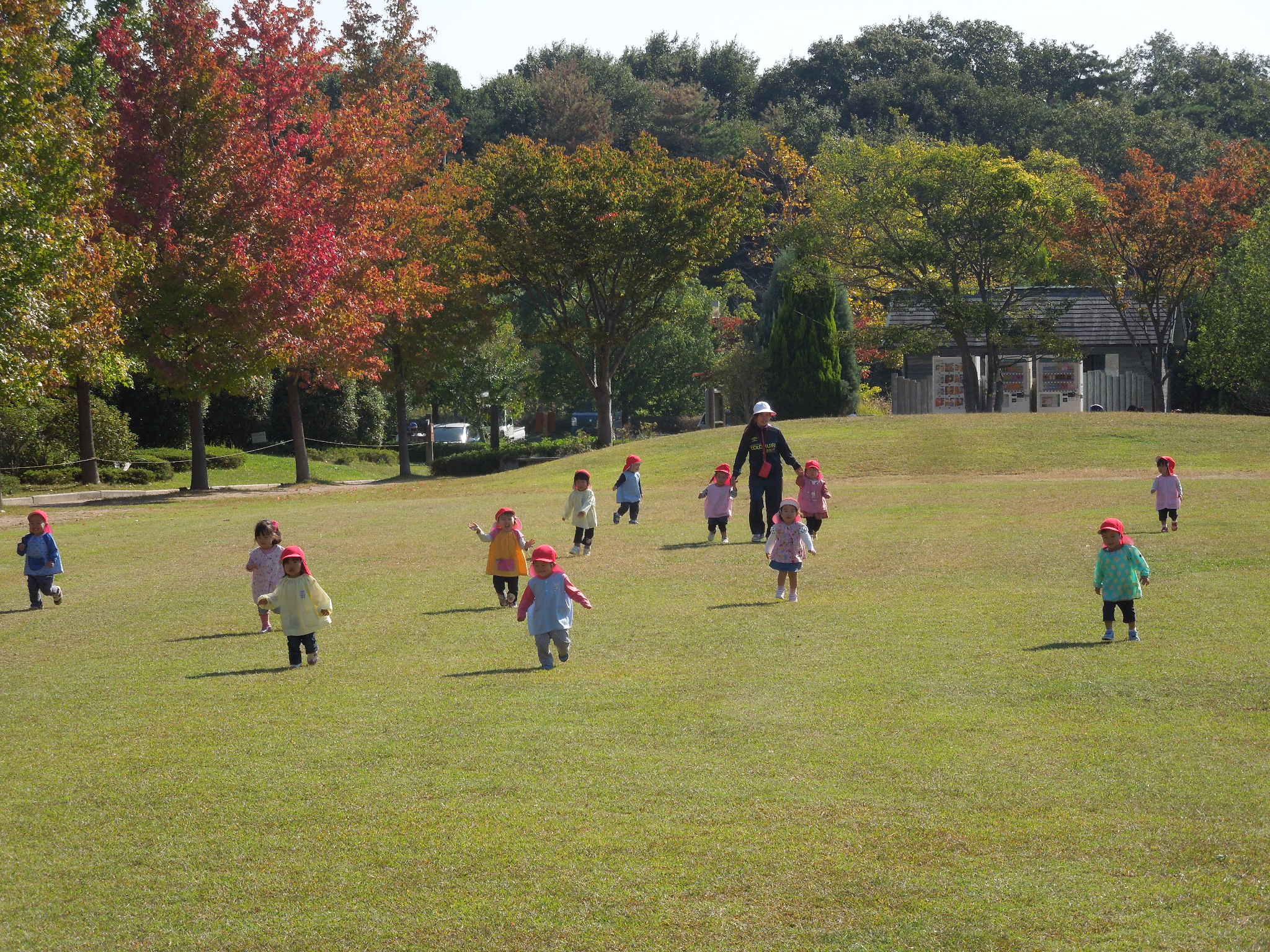 雲ひとつ無い秋晴れの中、ちゅうりっぷぐみの子どもたちが、三木山森林公園に出かけました。周りの木々の紅葉が始まった公園はとても美しく、すがすがしい気持ちになります。子どもたちは元気いっぱい走り回ったり、芝生の上を転がったりし、体を思いっきり動かして遊びました。自然を満喫した遠足になりました。