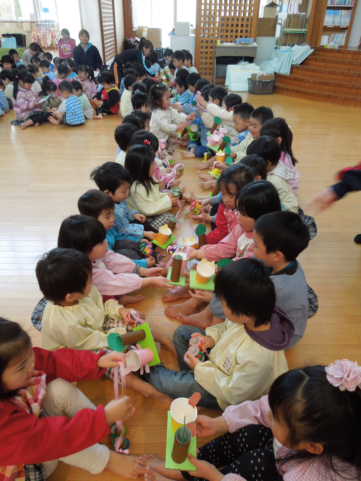 みんなで遊戯室に集まって、お別れ会をしました。先生のマジックショーはとってもおもしろく、いろいろなマジックに驚いたり、大笑いをしたりと、大喜びの子どもたちでした。大きなお友だちと小さなお友だちが「遊んでくれてありがとう!」「これからもよろしくね!」と、プレゼント交換をしました。給食は、色々なクラスのお友だちや先生とと混じり合って食べました。とても思い出に残るお別れ会となりました。