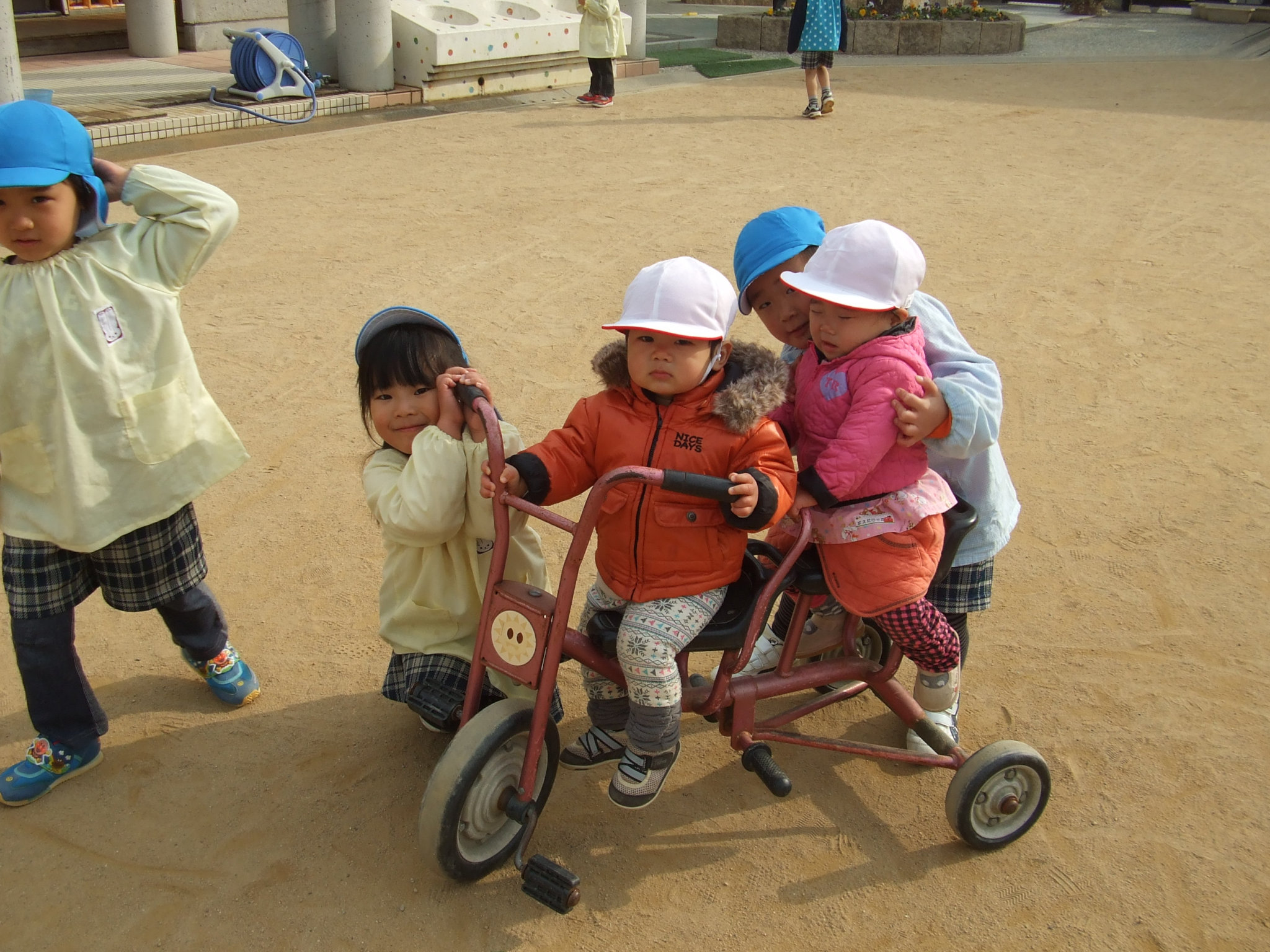 戸外遊びに出たときに、小さいクラスの友だちを見かけると、とってもやさしく声をかけることができるお兄ちゃん・お姉ちゃん達。戸外のあちらこちらで三輪車を押したり、手をつないで歩いたり、砂場遊びを楽しんだりする姿が見られます。相手を思いやる気持ちが芽生え始めています。