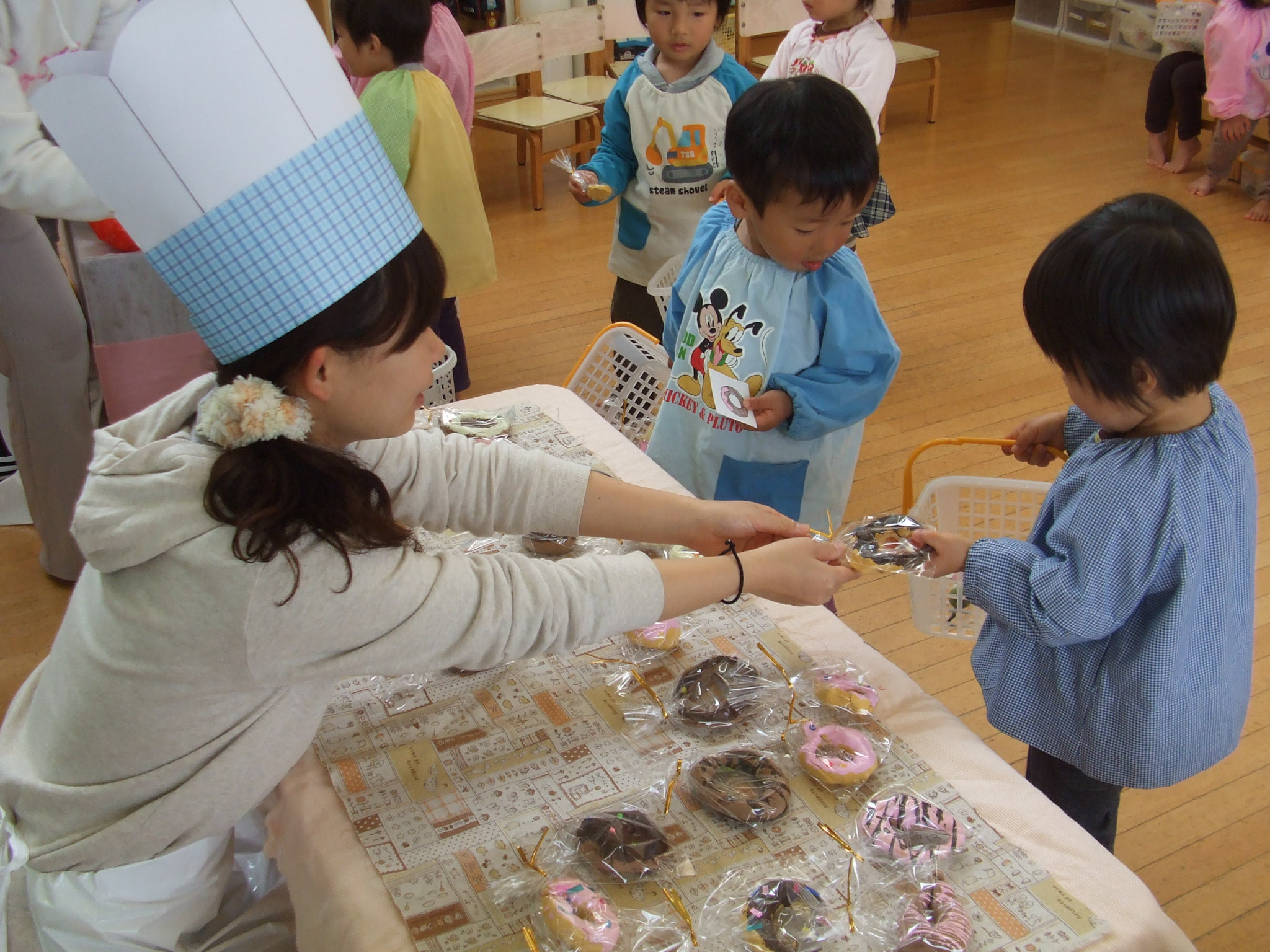 たんぽぽぐみのこどもたちが、自分たちで作ったドーナツやクッキーで、お店屋さんごっこを楽しみました。はじめてのおつかいは、ちょっぴりドキドキ!!無事に買えた後は、にっこり笑顔!