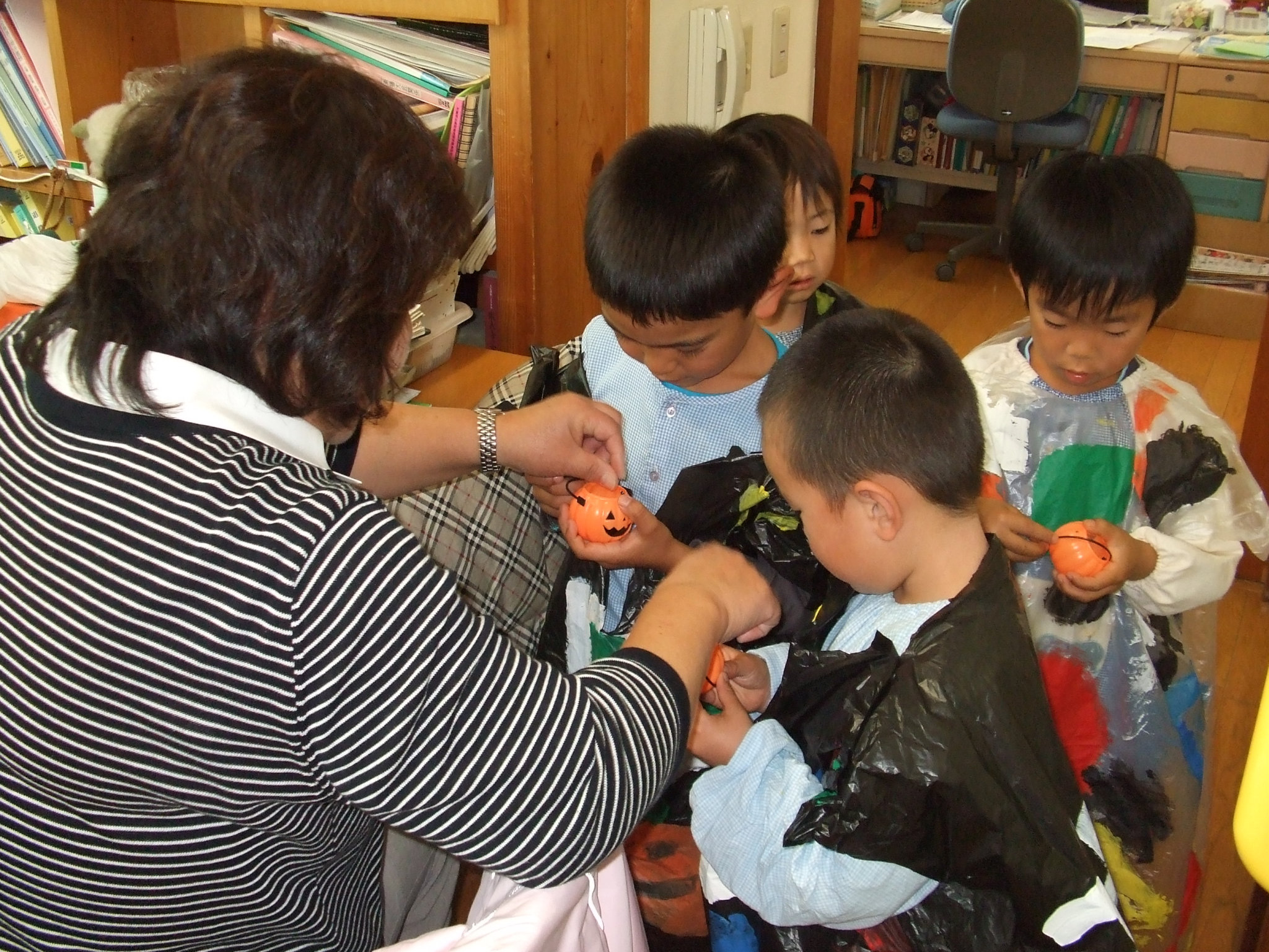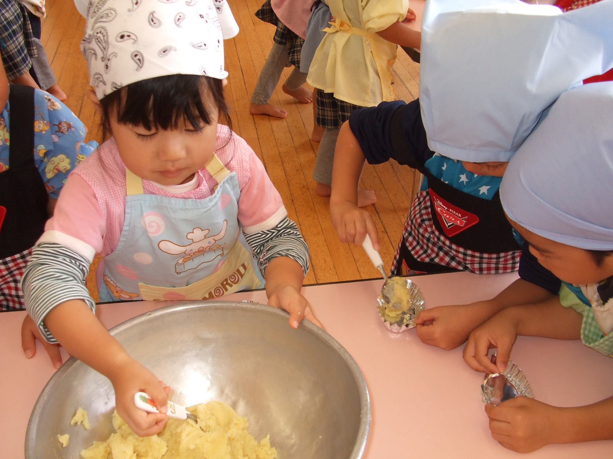 今年収穫したさつま芋を使って、スイートポテトを作りました。エプロンと三角巾を身につけ、とてもうれしそうな子どもたち。お芋をつぶしたり、カップに入れたり、楽しく作業を進めました。3時のおやつは、みんなニコニコ笑顔!!自分で作って食べると、またひと味違っておいしいね♪