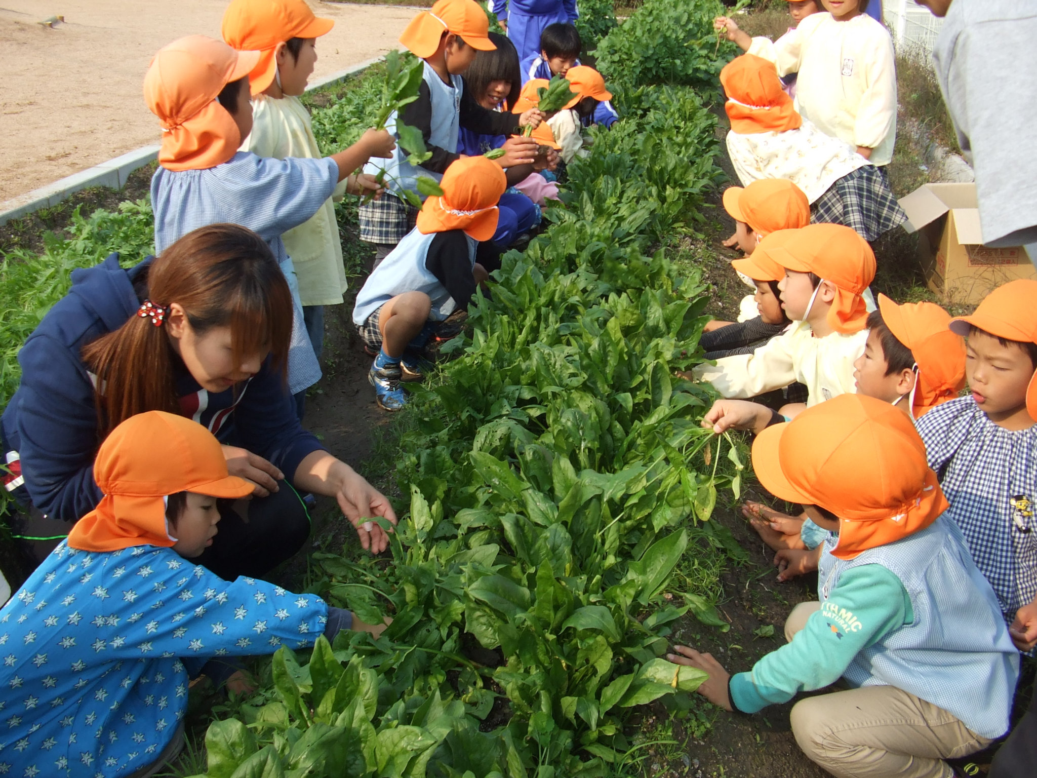 ほうれん草の収穫です!大きく育ったほうれん草を、大事に大事に収穫しました。みんなで収穫したほうれん草は、次の日の給食「野菜のミルクスープ」に入れて頂きました。次は大根・水菜の収穫です!