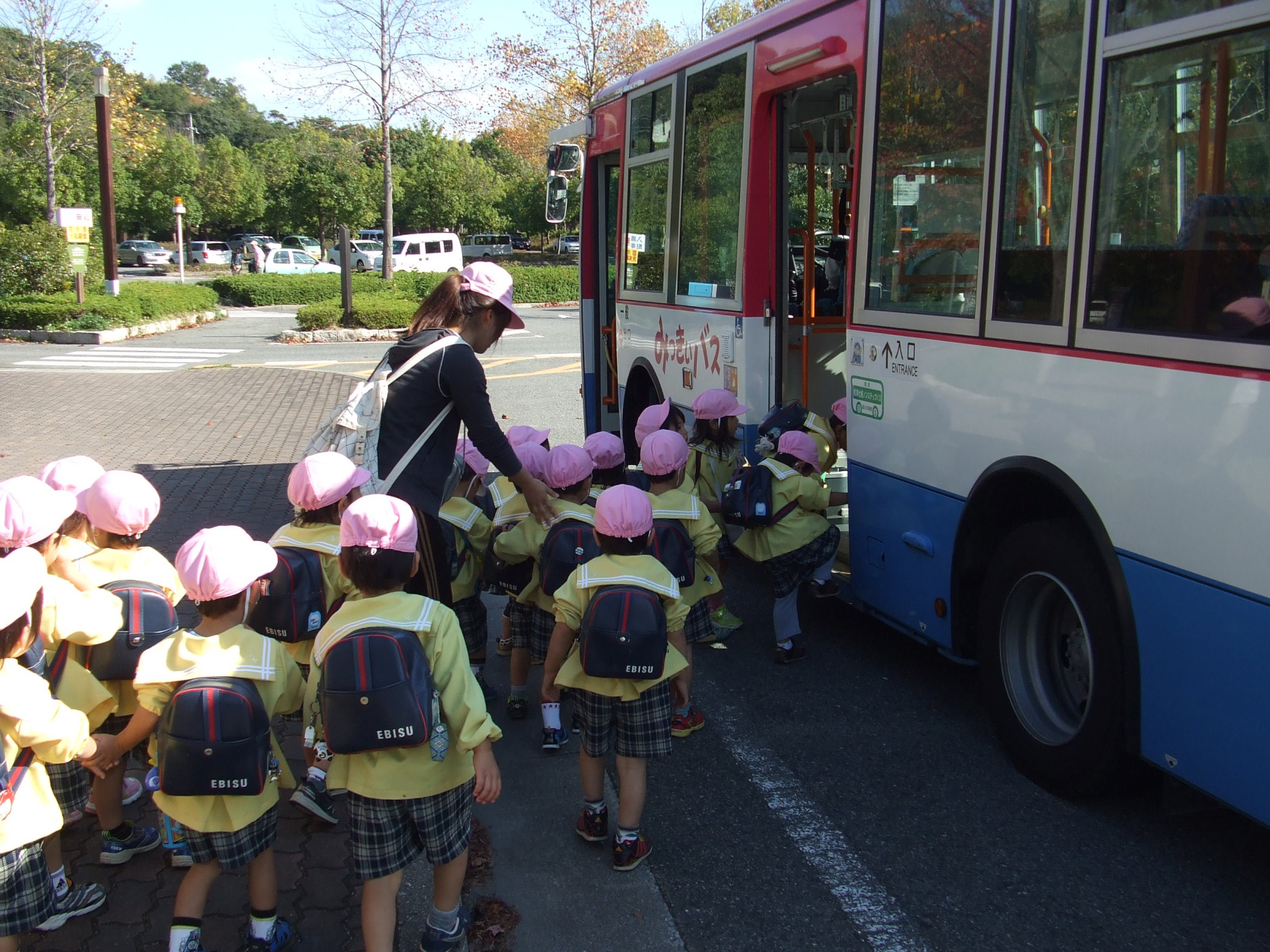 ももぐみの子どもたちが、みっきいバスに乗って森林公園に出かけました。お弁当の入った重たいカバンをしっかり背負い、頑張って歩きました。バスはたくさんのお客様が乗られていましたが、お話をしたりお膝にのせてもらったりと、とても楽しく過ごしました。