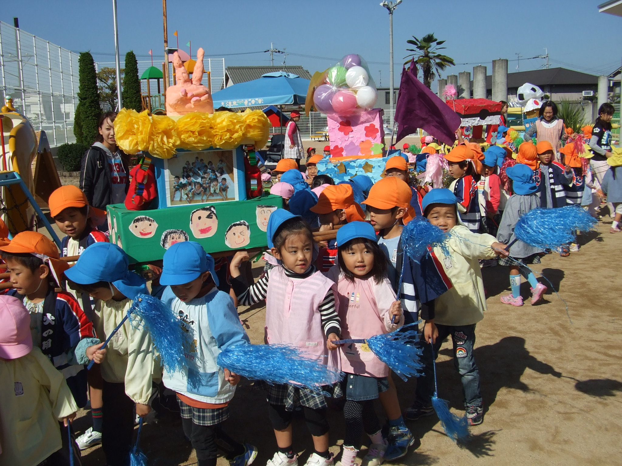 今日は待ちに待ったお祭りごっこの日!ぶどうの日のグループで作った、個性ある屋台が勢揃いしました。「よいやさ〜」のかけ声も大人顔負けです・・・。祇園囃子を披露してくれたお友だちもいましたよ。