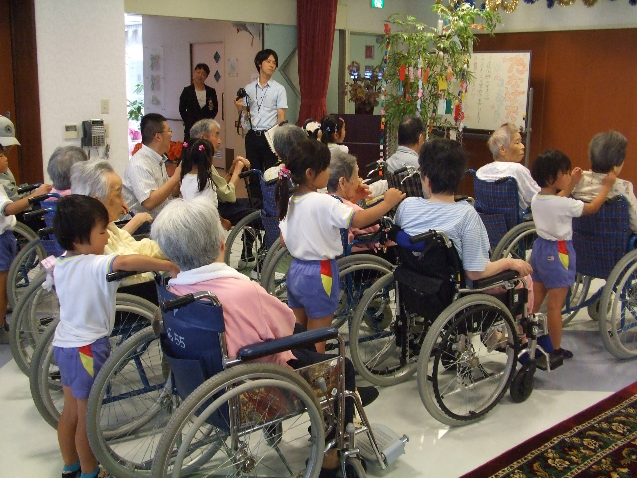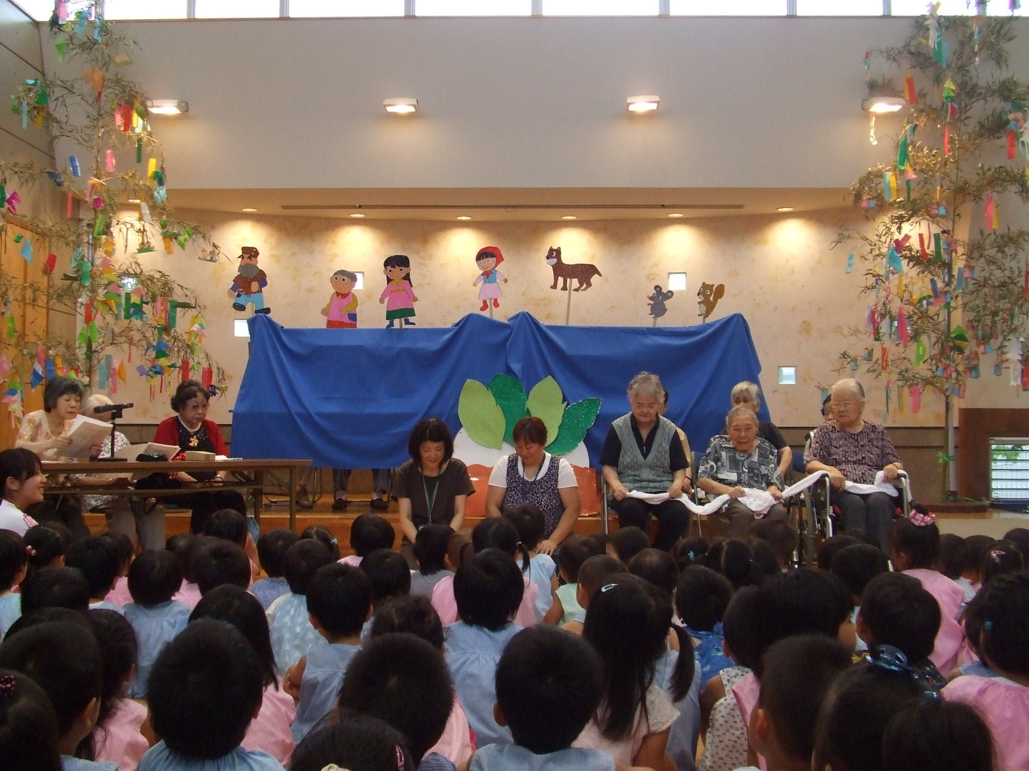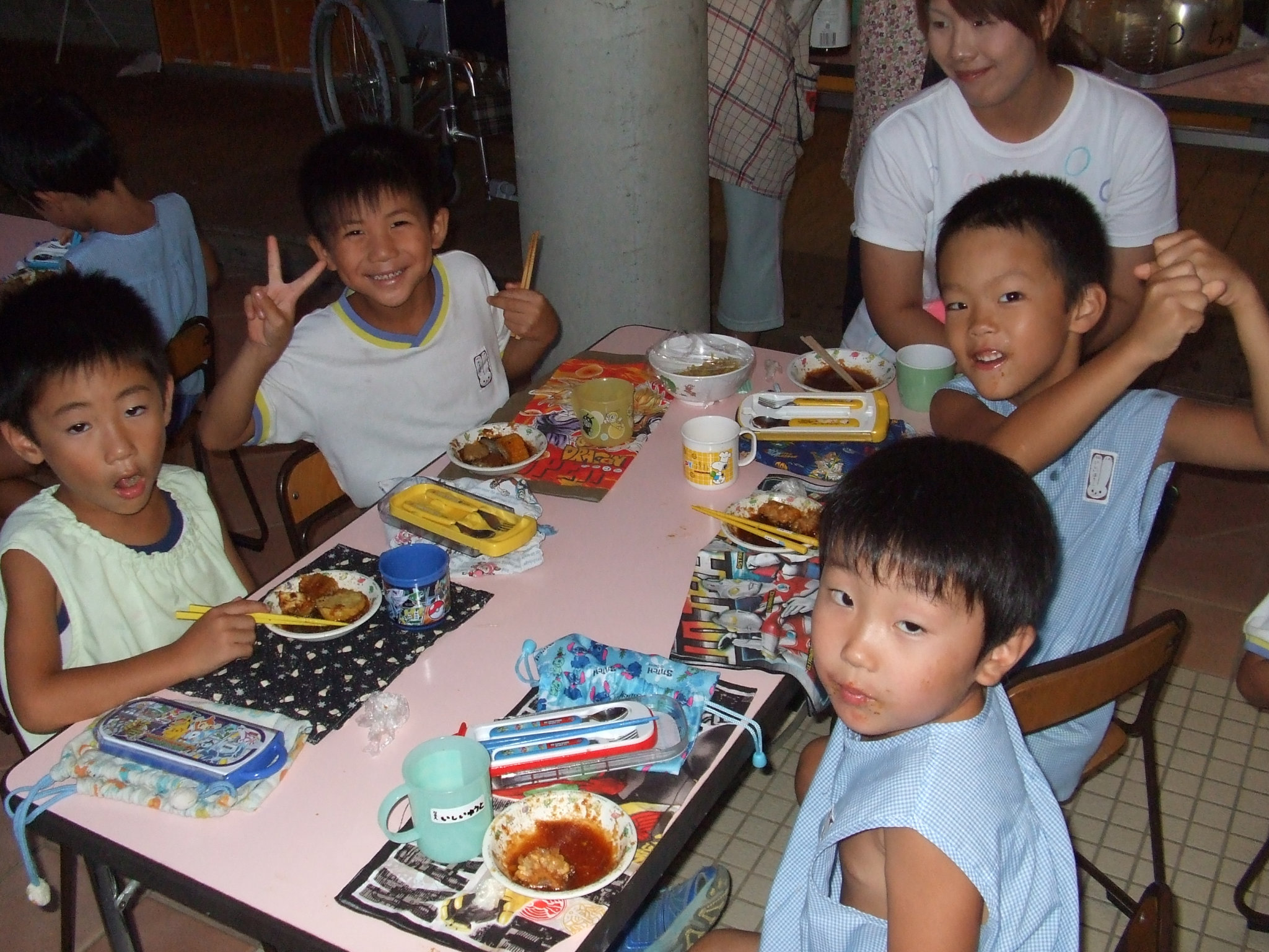 ひまわりぐみの子どもたちがお泊まり保育をしました。1日目は、まず、グループに分かれて色々なゲームを仲良く楽しみました。次に、みんなが昨年から「お泊まり保育で、怖いお話ししてね!」とお願いをしていた、副園長先生のお話タイム。おねだりしていた通り、怖〜い「番町皿屋敷」のお話をしていただきました。怖いのを我慢して真剣に聴き入っていました。そして夕ご飯の買い出しと準備!ジャガイモの皮をむいたり、包丁でピーマンを切ったりしました。 なかなか割れないスイカ割り・・・。「右!右!左!左!そこ〜!!」と大はしゃぎ。みんなで食べたバーベキューはおいしく、何度もお代わりをしましたね。