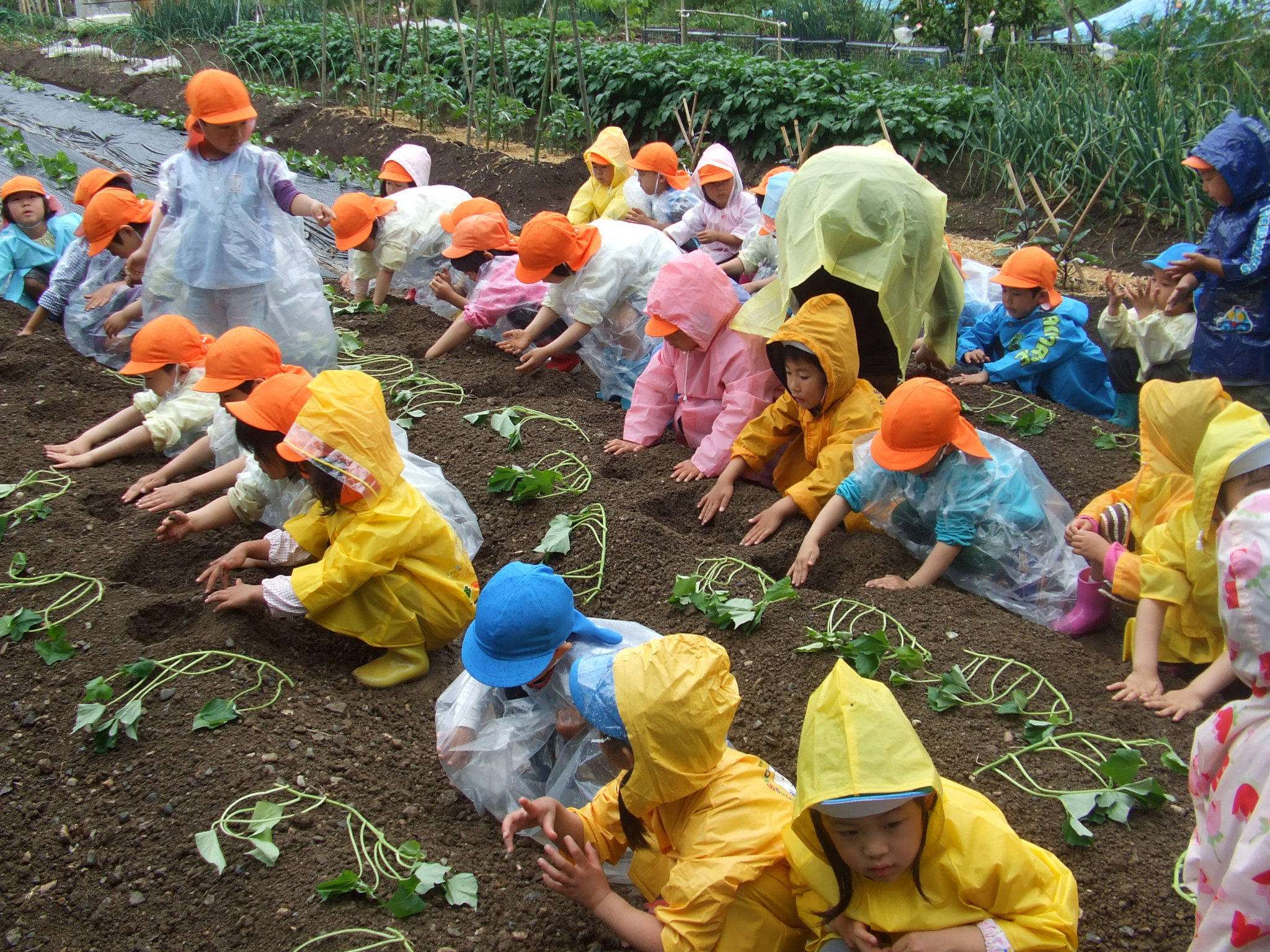 あいにくのお天気でしたが、芋のつる植えをしました。水を含んだやわらかい土を掘り、丁寧につるを置き、しっかりと土をかぶせていました。植え終わったあとに、手を合わせ「大きなお芋が出来ますように!」とお願いをする姿も見られました。秋の収穫が今から楽しみです。