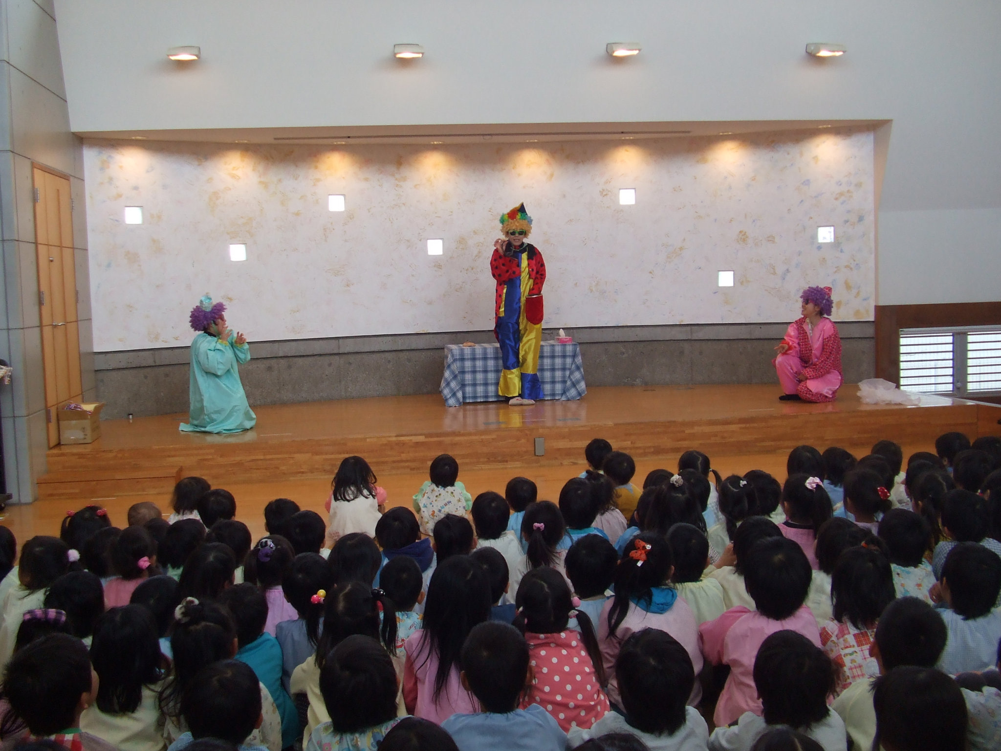もうすぐ保育園を卒園するお兄さん・お姉さんを送る会、お別れ会をしました。今日は、遠い国からピエロ??も遊びに来てくれました。そのピエロのマジックに驚く子どもたち!!みんなでダンスをしたり、プレゼント交換をしたり、一緒に給食を食べたり・・・と楽しい時を過ごしました。