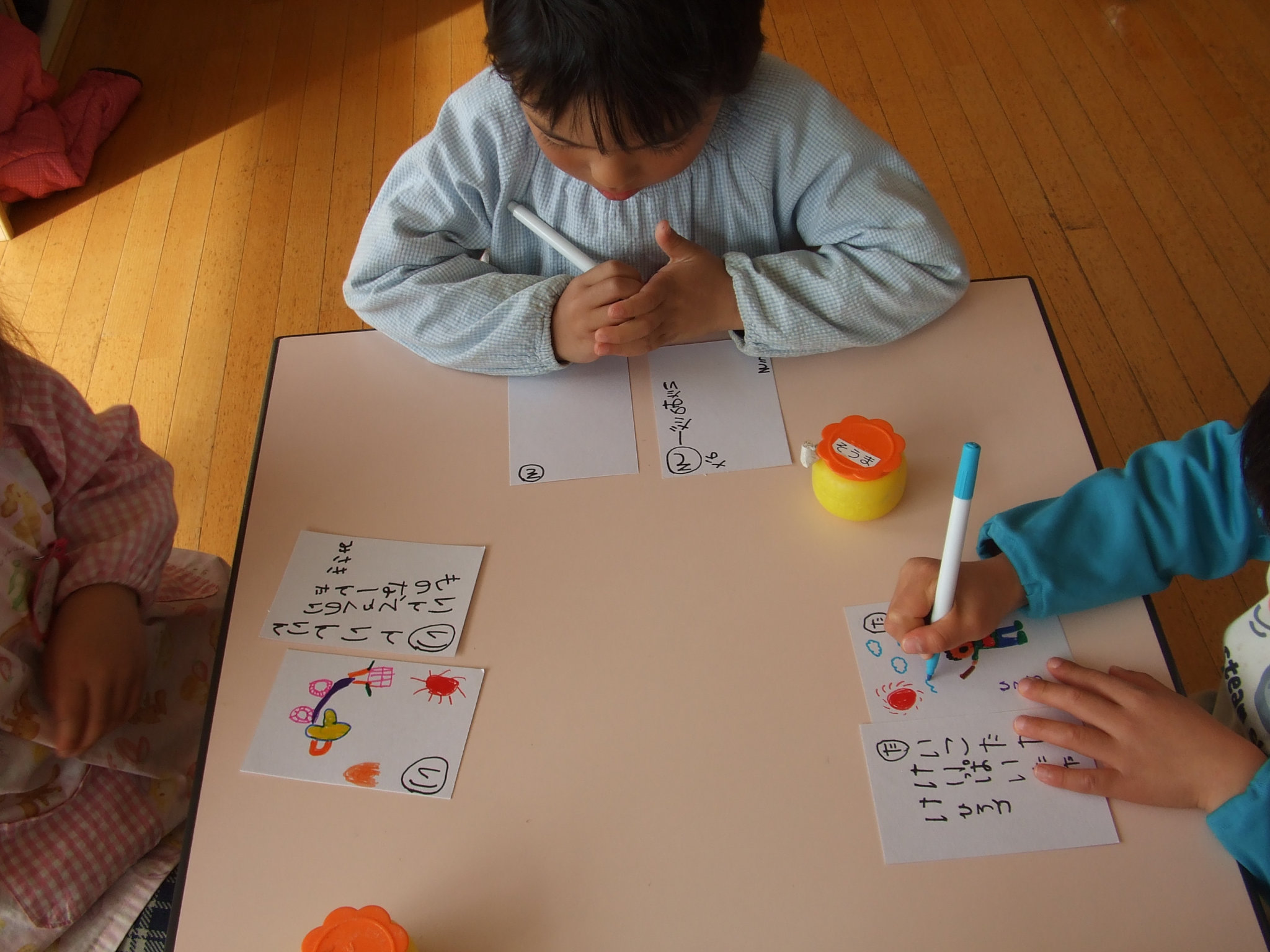 ばらぐみの子どもたちがカルタを作りました。好きな文字を選んで「文章」と「絵」を完成させました。子どもたちの発想はとても豊かで、大人では思いつかないようなとてもおもしろく、また、かわいいカルタが出来上がりました。