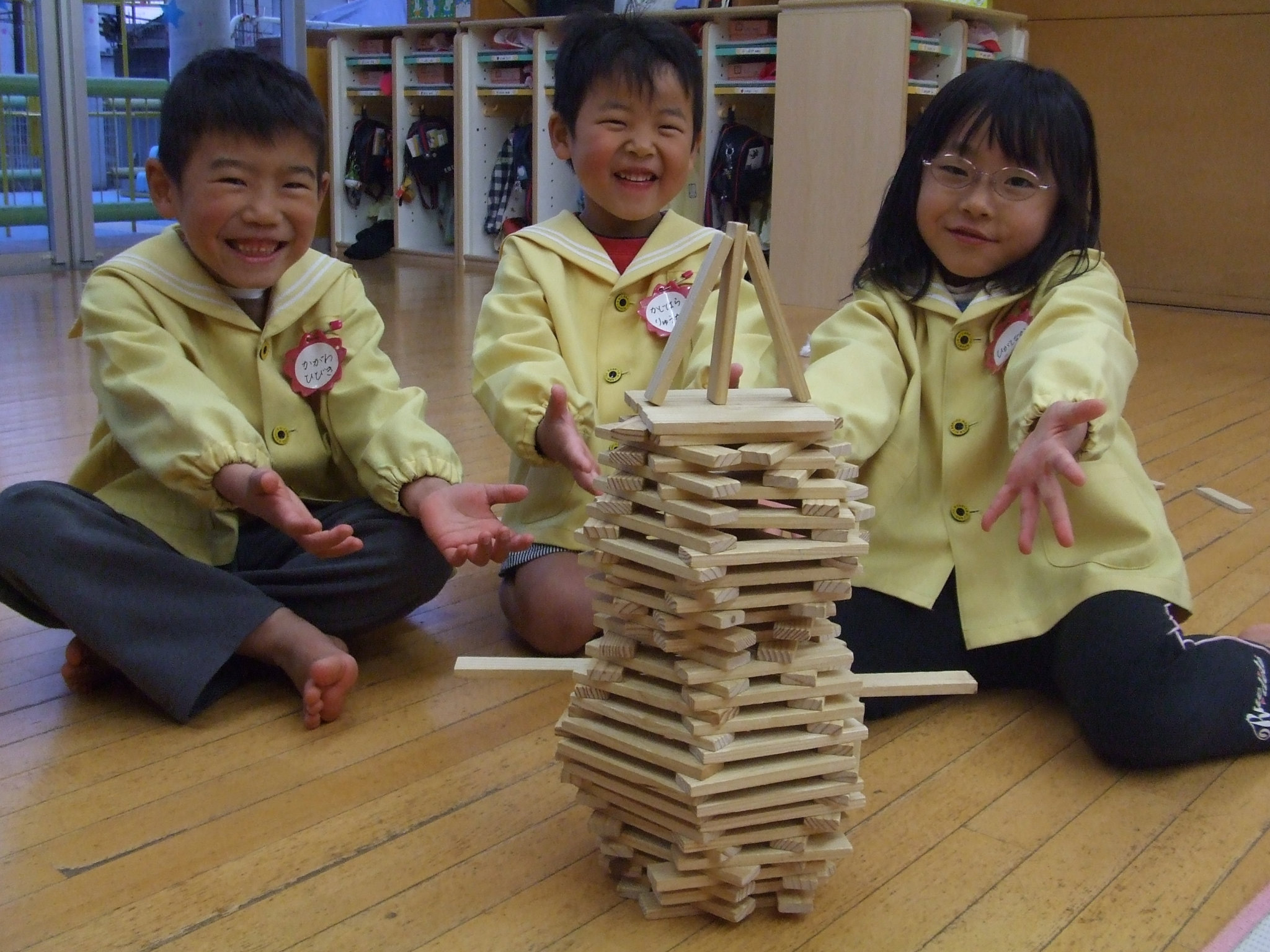 このところなかなか雪は降らないけれど・・・積み木(カプラ)で雪だるまを作ってみました!ばらぐみの子どもたちと先生が、協力し合って作りました。次はもっと複雑な物に挑戦だ!!