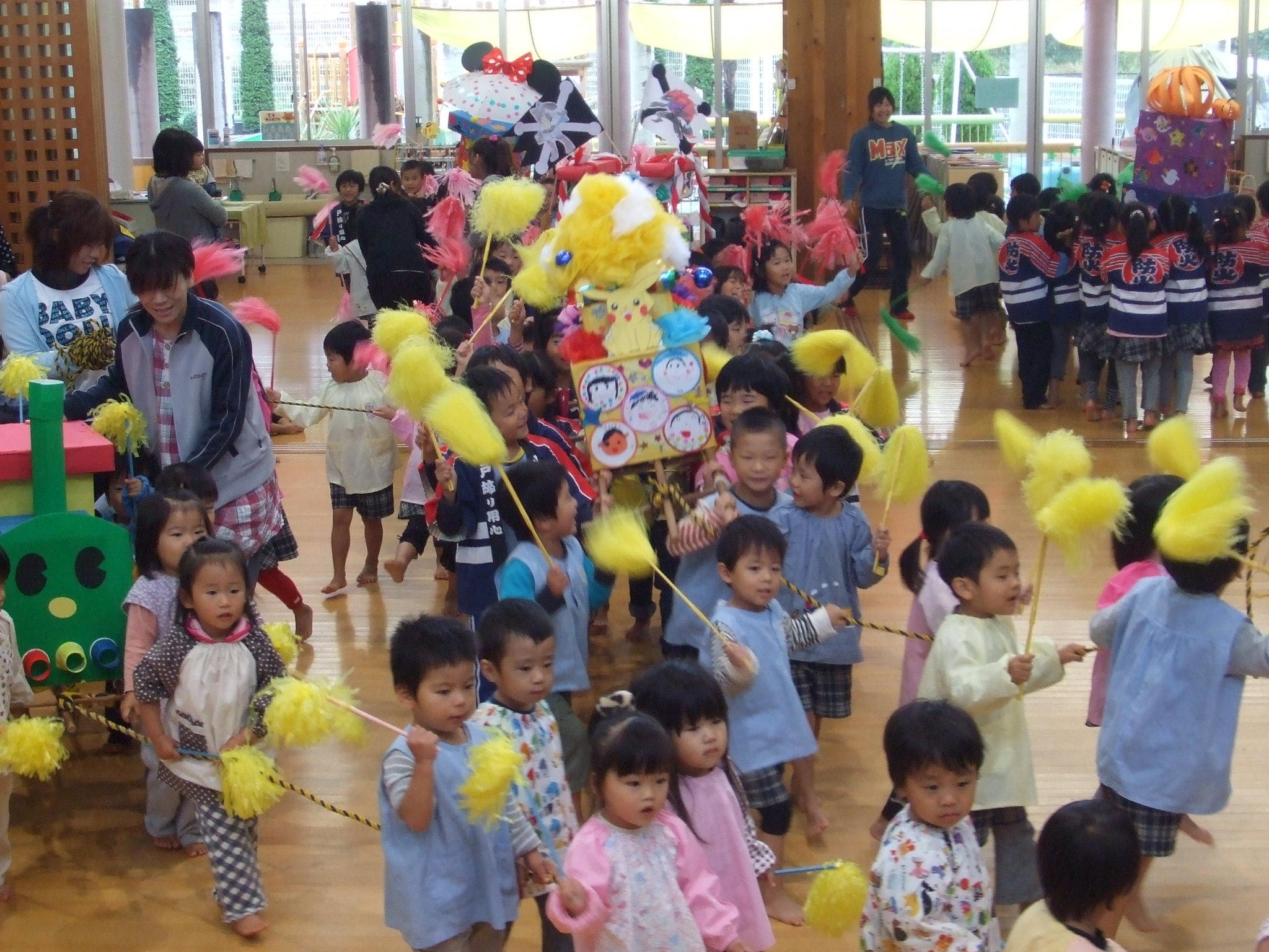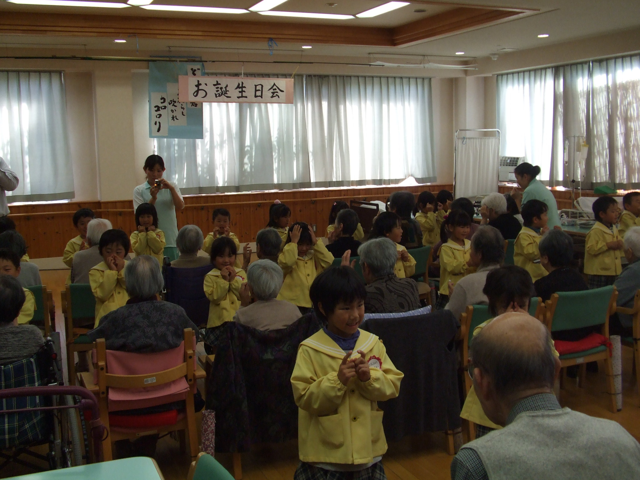 ばらぐみの子どもたちが、デイサービスセンター三木東にでかけました。お誕生会に参加さて頂き、ばらぐみの子どもたちはお歌と手遊びのプレゼントをしました。特に♪げんこつやまのたぬきさん♪は子どもたちもおじいさんおばあさんも張り切って、大盛り上がりでした。また、おじいさんおばあさんの間に入れていただき一緒におやつを頂きました。「かわいいね〜」「かしこいね〜」といっぱい誉めていただき、子どもたちはとってもうれしそう!!たくさんおみやげも頂きました。デイサービス三木東のみなさんありがとうございました!!
