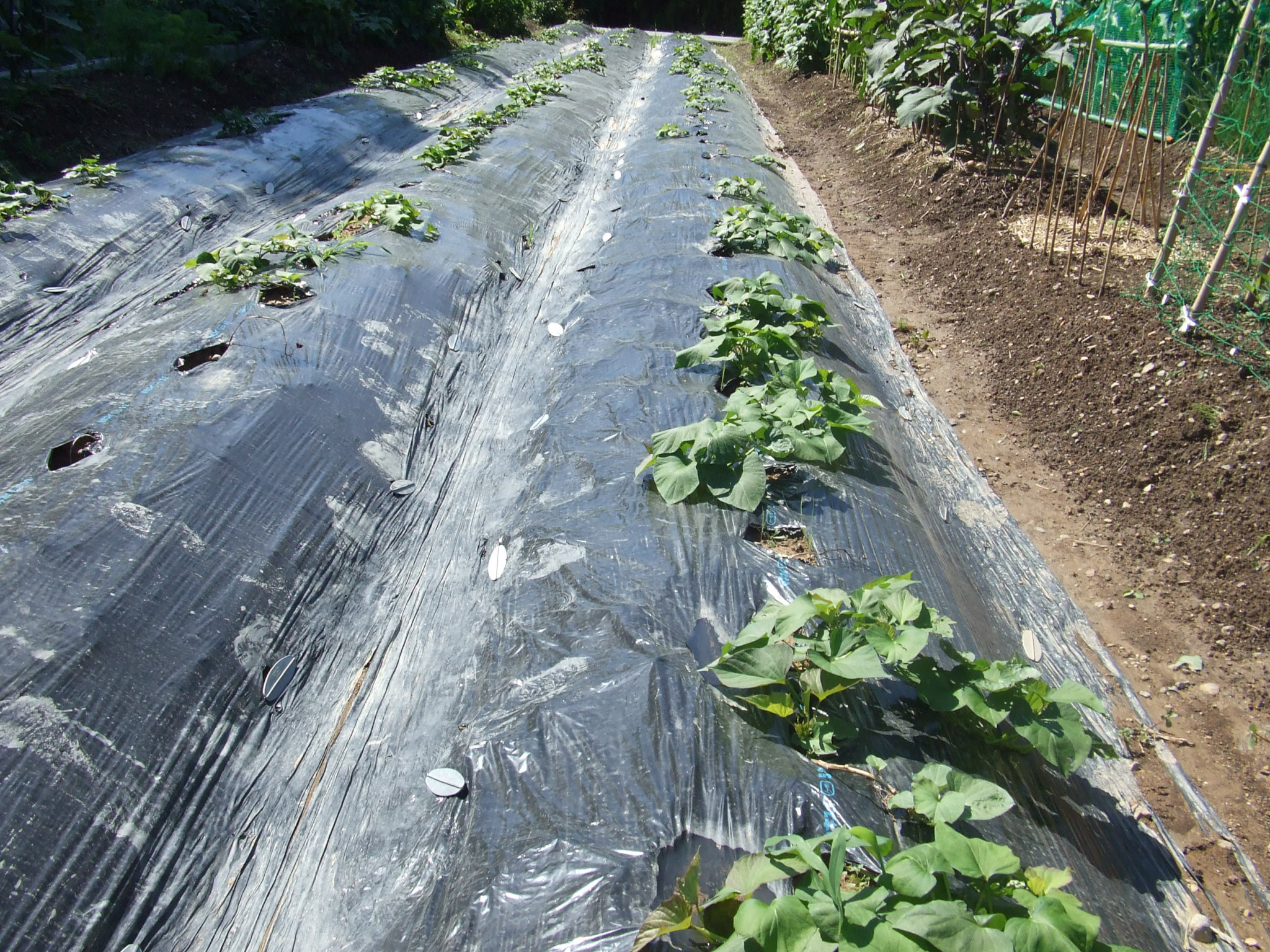 「さつま芋は元気かなぁ〜?」と芋畑をのぞくと、元気にピンッとつるがのびていました。「ホッ」と一安心。このごろの雨で、水やりも少し一休み中です。