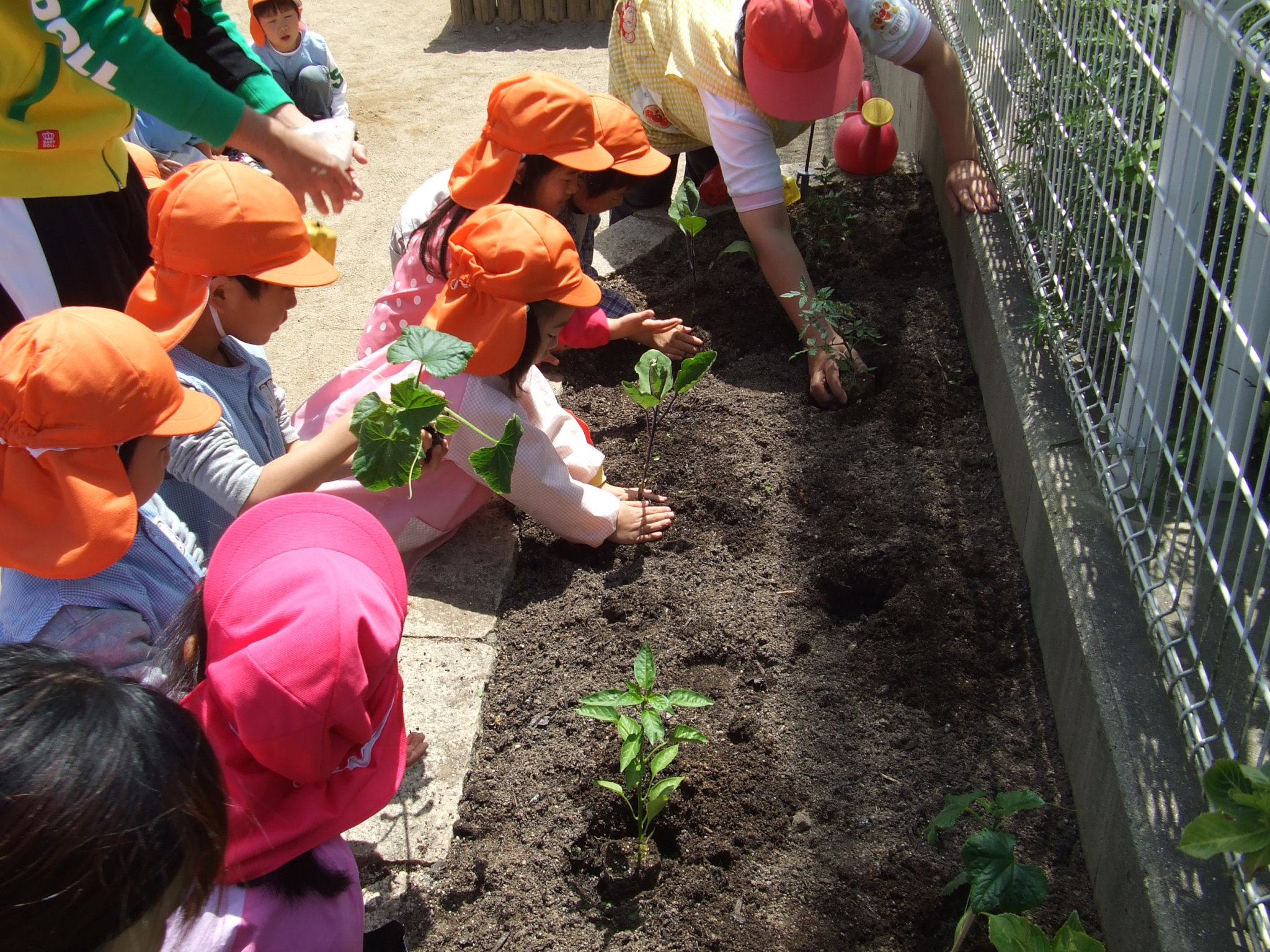 ひまわり・ばらぐみの子どもたちで、夏野菜の苗を植えました。トマト・ピーマン・きゅうり・なすの4種類を植えました。これから、毎日水やりをしたり、観察をしていきます。収穫が楽しみですね。
