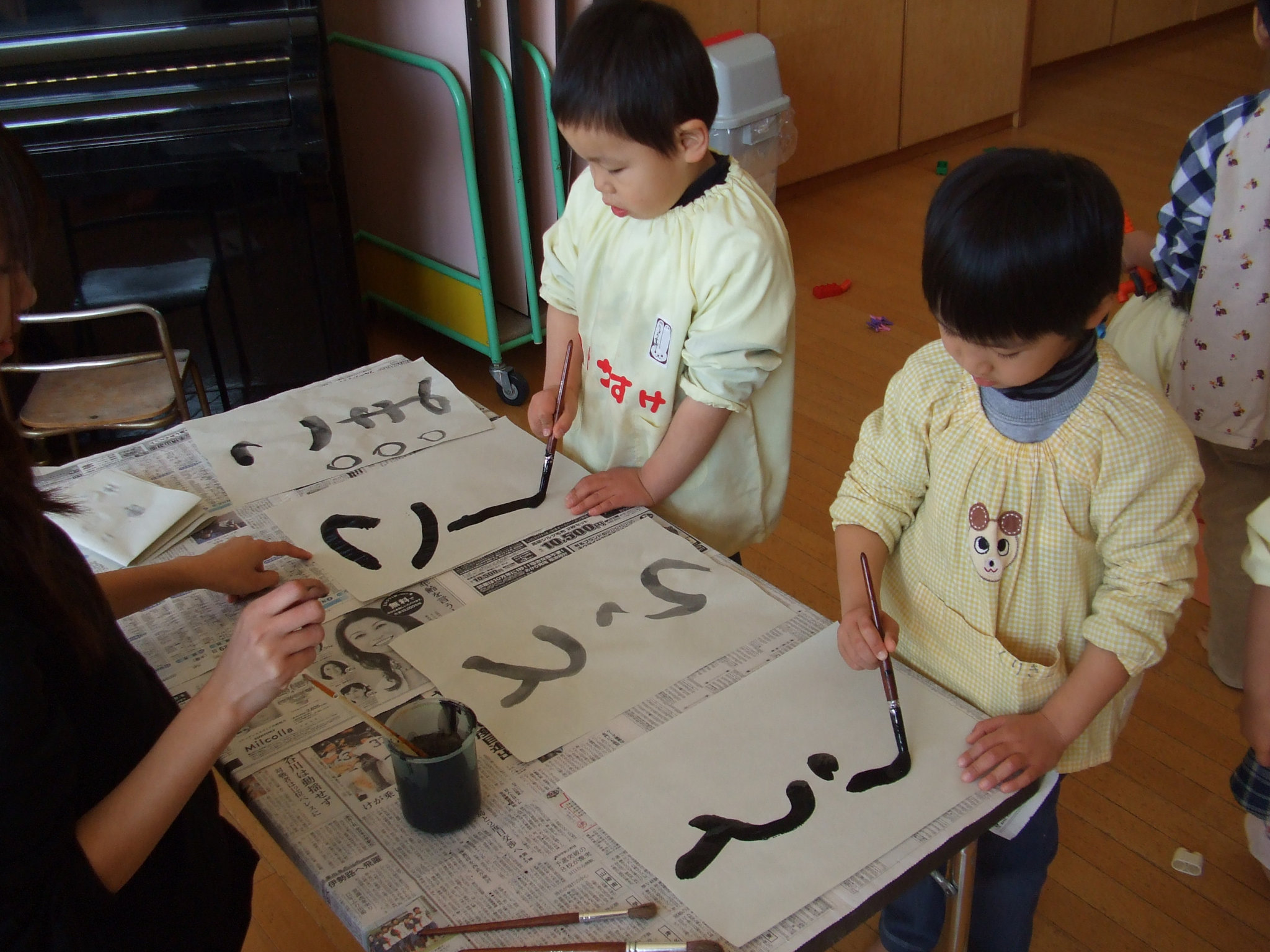 今日は「書き初め」をしました。作法にはこだわらず、とにかく筆を持って字を書いてみました。「こま」「たこ」「とら」「もち」・・・など、お正月・新年にちなんだ言葉を書きました。筆を持つと真剣な表情で向かう子どもたち!みんなしっかりいい字が書けましたよ。