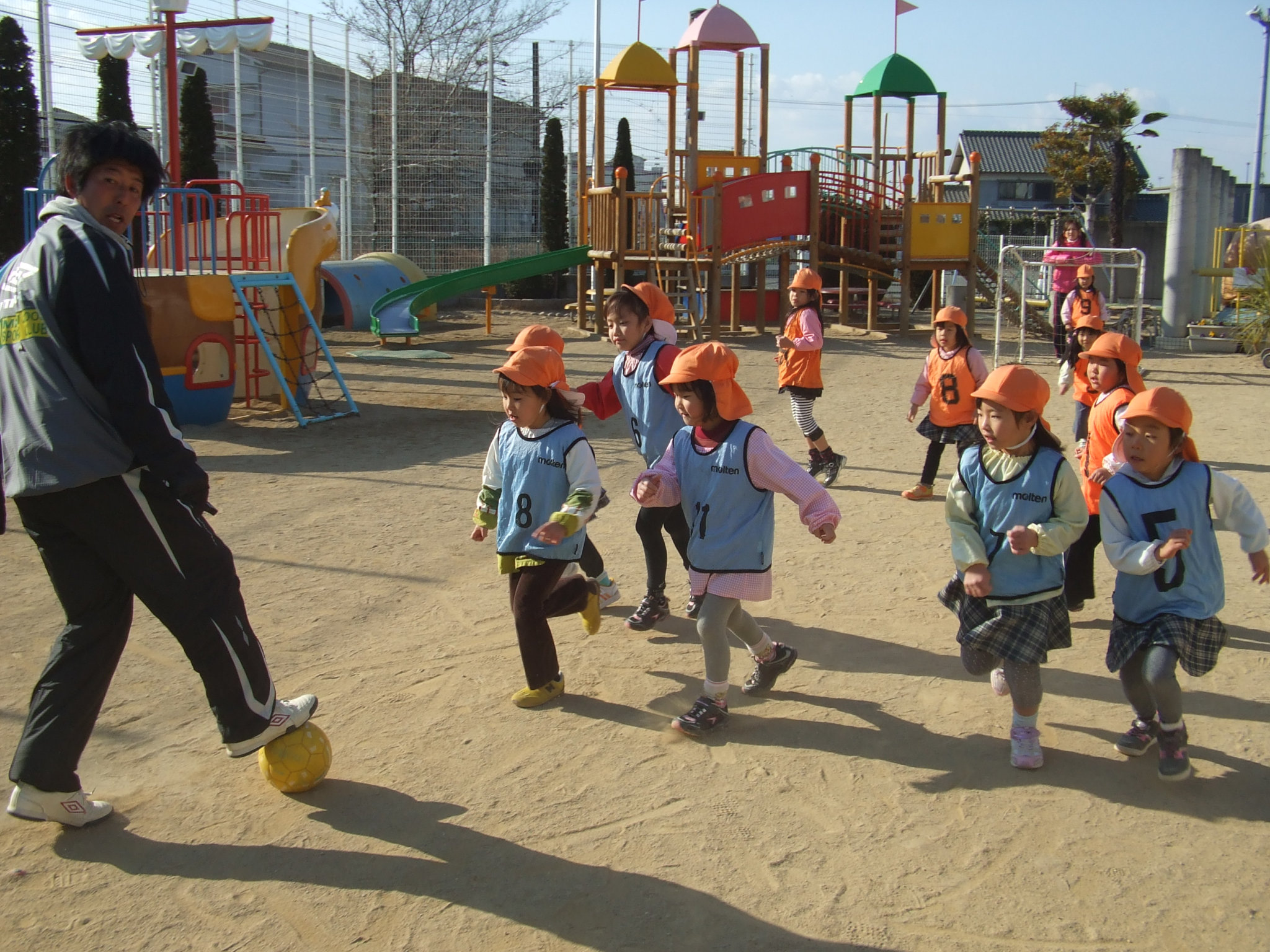 サッカー教室がありました。ひまわりぐみの子どもたちはサッカー大好き!!運動場を所狭しと走り回り、サッカーボールを追いかけています。シュートをうつ格好も決まっています。