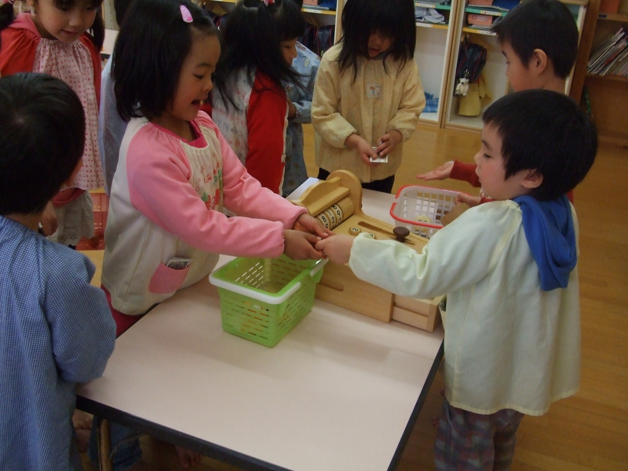 ぶどうの日でお買い物ごっこをしました。異年齢同士ペアを組み、お母さんやお父さんになりきって、Let’sショッピング!!レジでは「いらっしゃいませ」「1000円になります」など、かわいい店員さんとのやりとりがたくさん見られました。みんな大人の姿をよく見ていますね(*^_^*)