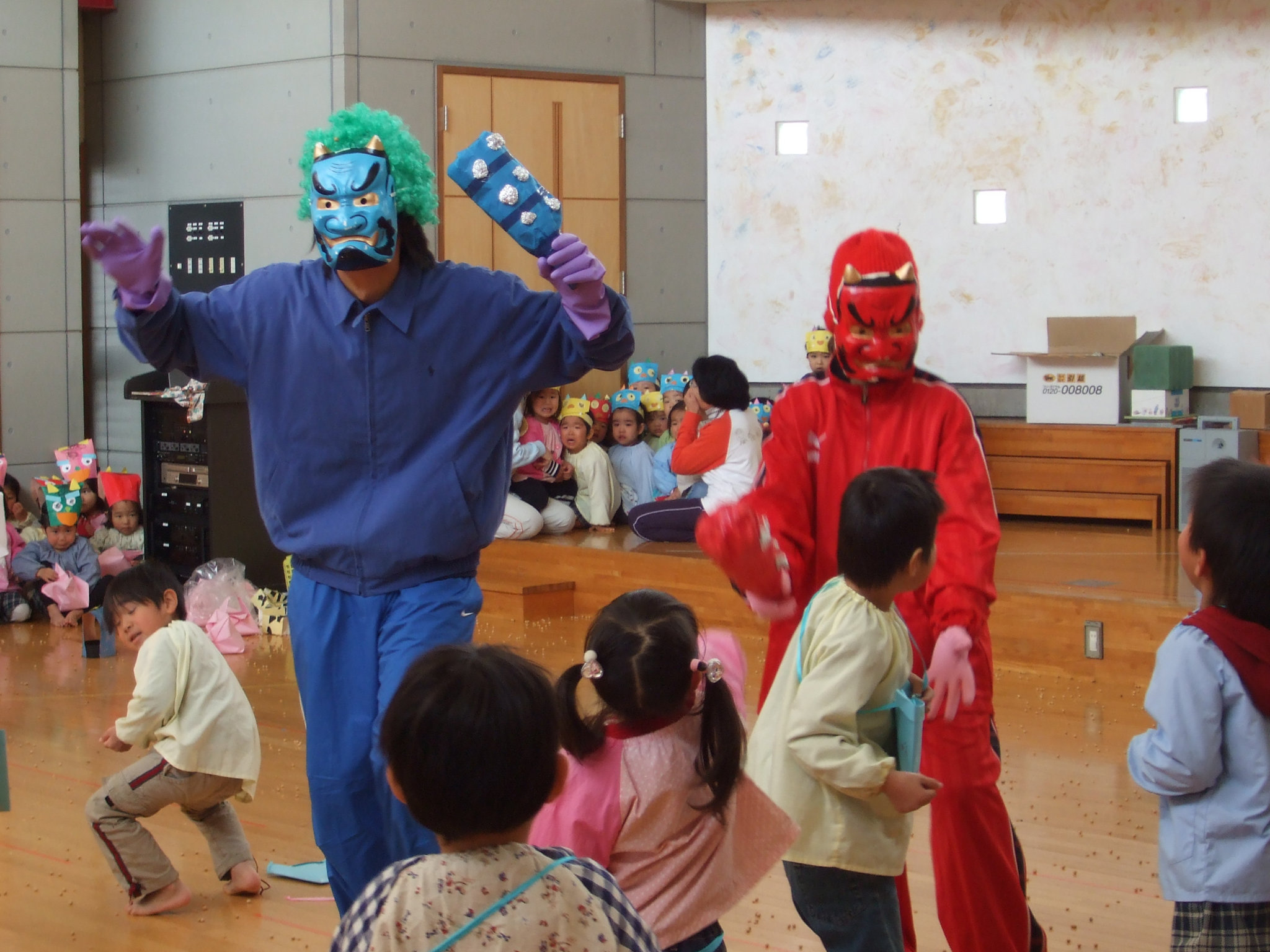 伝統行事「節分」にちなんで、節分会をしました。節分の由来のお話を聞いたり、楽しいゲームやダンスの後、豆まきをしました。小さなお友だちは、大きいお兄ちゃんお姉ちゃんたちが扮するちびっこ鬼に向かって「おには〜そと〜」と豆を投げました。その後、青鬼・赤鬼が登場!!怖くて泣いてしまう子もいましたが、しっかり「ふくは〜うち〜!」と鬼に向かって豆を投げていました。泣き虫鬼や怒りんぼ鬼はどこかへとんでいったかな?