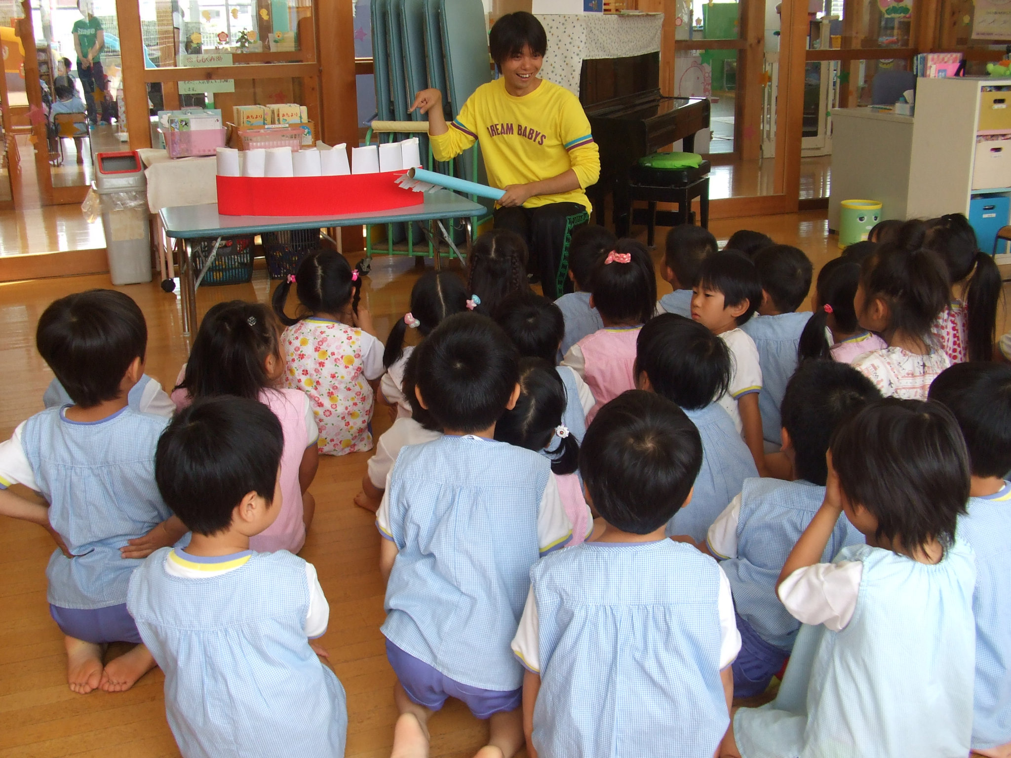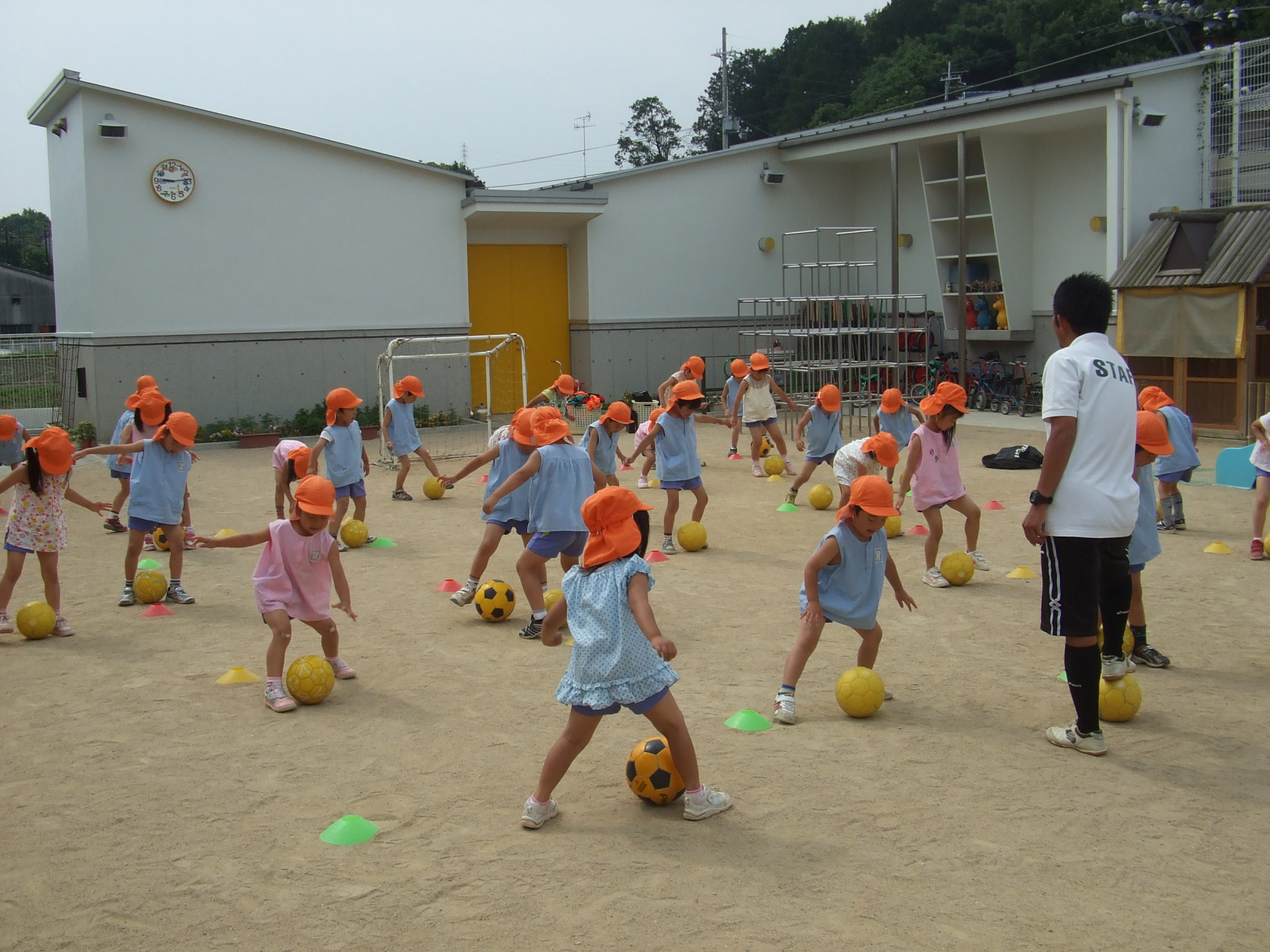 ひまわりぐみの子どもたちが、サッカー教室に参加しました。とっても楽しみに、はりきって登園してきた子どもたち!ボールに触れるところから始まって、ドリブル・シュートなど、なかなかハードな1時間でしたが、ミニゲームも楽しめました。1時間では足りずに、「もっとする〜!」とコーチにおねだりする場面も!!