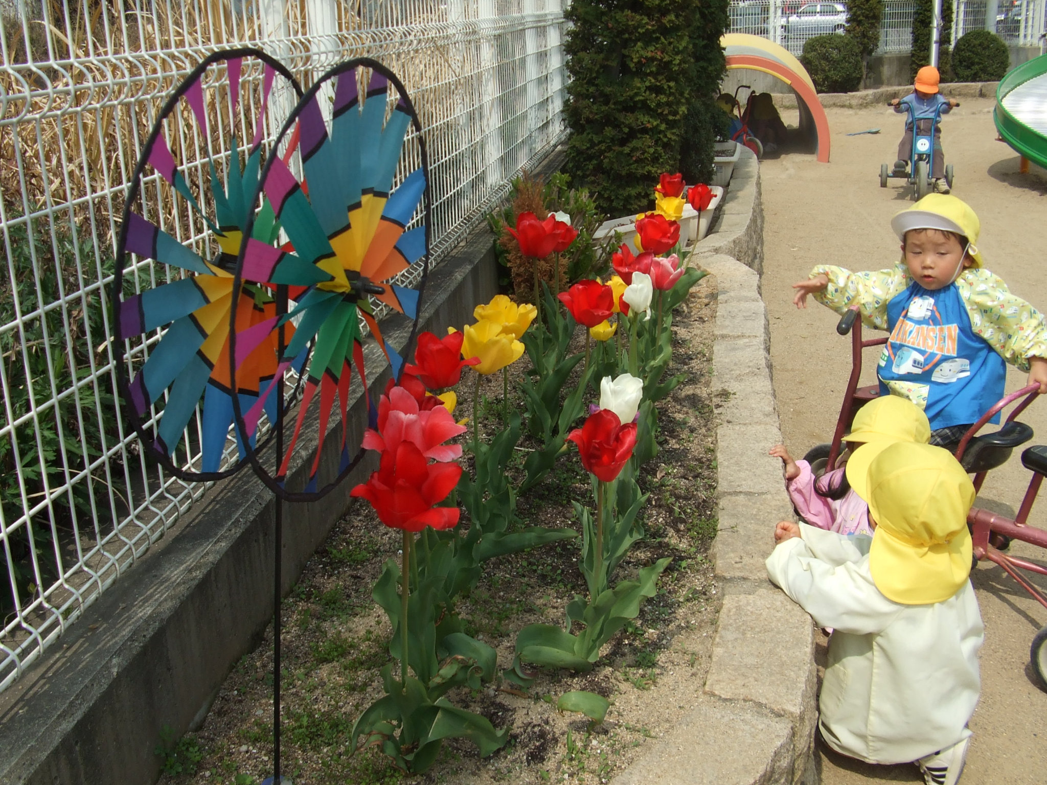 園庭にきれいなお花がいっぱい咲いています。いろとりどりのちゅうりっぷに見とれる子どもたち!「私はあか!」「僕はしろ!」「私はピンク!」とおしゃべりの花も満開です!!