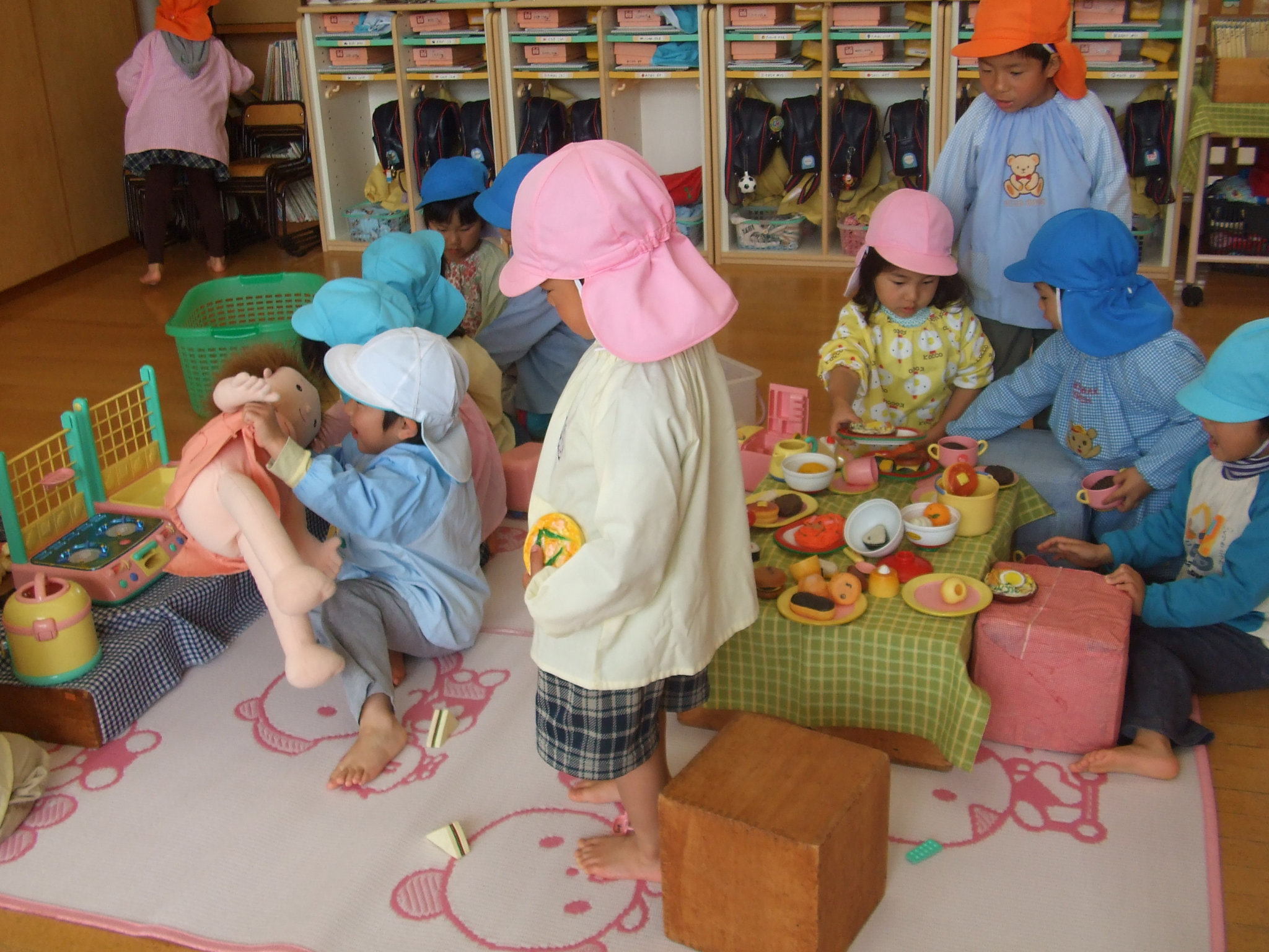 今年度初めてのぶどうの日!初めて参加する新入園児とももぐみの子どもたちは、ひまわりぐみのお姉さんお兄さんにてをひかれ、色々教えてもらいながらはりきって遊びました。写真は「ごっこあそび」のコーナーです。