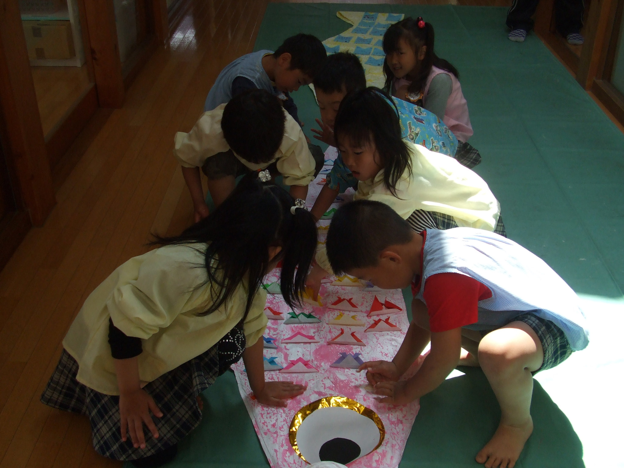 こどもの日の向けてこいのぼりを作っています。ももぐみ以上のクラスは、みんなで協力して大きなこいのぼりを作りました。小さなクラスは一人づつかわいいこいのぼりを作りました。みんなこいのぼりみたいに元気に大きく育ってくれることを願います。