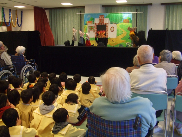 カトレア三木の皆様に、「人形劇を一緒に観ましょう!」とお誘いを受け、ももぐみとふじぐみの子どもたちが出かけました。『さんびきのこぶた』のお話を楽しんだ子どもたち!最後にはお歌も披露し、おじいさん・おばあさんと仲良くなれましたね。