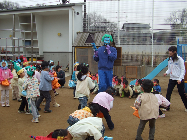 日本の伝統行事である「節分」にちなみ、節分会を行いました。節分の由来のお話を聞いたり、『泣いた赤鬼』の影絵をみたりしました。それぞれ自分で作った鬼の面とさんぼうを持って、豆まきもしましたよ。先生扮する「鬼」の登場には大騒ぎの子どもたち(>_<)でも、泣き虫鬼や怒りん坊鬼をやっつけることができました。