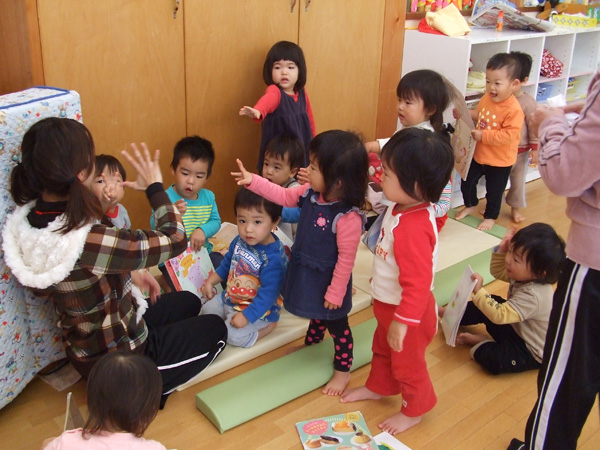 1歳児さんのお部屋から可愛い歌声が・・・そーっと見に行くと♪げんこつやまのたぬきさん〜♪と一生懸命にうたう子どもたちの姿がありました。ジャンケンでは、難しいチョキもじょうずにできるようになりました!!
