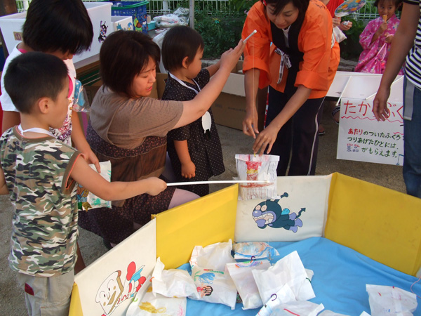 平成20年度の夕涼み会が開催されました。可愛い浴衣を着て、うれしそうにお家の方と手をつなぎ、宝袋釣りやシュートボール、ボーリングにわなげ・・・といろいろな夜店コーナーを楽しんでいる姿が見られました。盆踊りも上手に、元気よく踊っていましたね。楽しいひとときを過ごした夕涼み会でした。