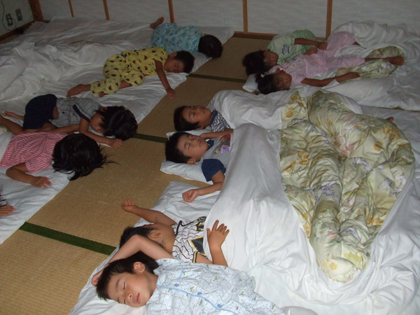 夜はみんなで布団を並べて寝ました。少し寝相の悪い子や、寝言を言ったり、寝ながらなにやらポーズをとる子も・・・そんな子どもたちの姿を楽しむ先生達でした。