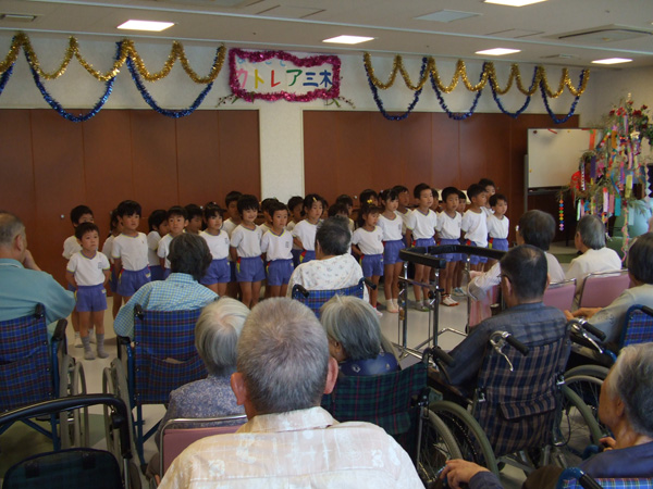 ひまわりぐみの子どもたちが、カトレア三木に出かけ、おじいさん・おばあさんとの交流を楽しみました。マリンバの素晴らしい演奏を聴いたあと、みんなで「童謡メドレー」のうたの披露をしました。おじいさん・おばあさんも昔を懐かしむように一緒に口ずさんでくださいました。