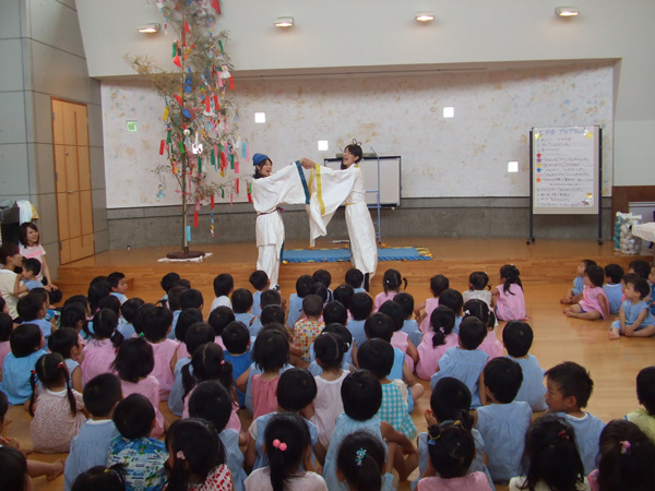 七夕会をしました。七夕の由来のパネルシアターをみたり、ゲームをしたりと大盛り上がりでした。織り姫と彦星の登場に大喜びの子どもたち。「みんなの願い事を叶えるよ!」と約束してくれました。