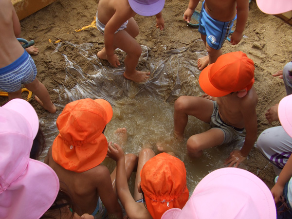 暑い毎日・・・。でも子どもたちは元気いっぱいです。パンツ1枚で外へ飛び出し、水遊び・泥んこ遊びに夢中です。中には少し苦手な子もいますが、夏が終わる頃には、みんな真っ黒に日焼けして、よりたくましくなりそうな気がします。泥遊びだけでなく、しゃぼん玉や、水鉄砲、色水遊び・・・と夏ならではの遊びを満喫しています。
