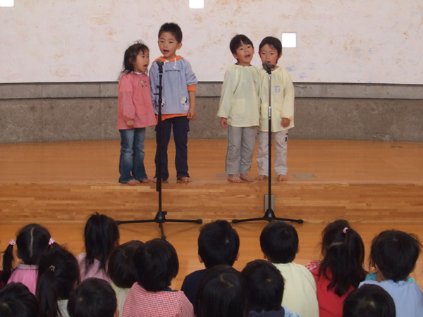 「あ〜ドキドキする!」と緊張していたこどもたち。みんなで手のひらに「人」を書いて飲み込むおまじないをしたね(*^_^*)終わった後、「ドキドキしたけど楽しかった!」と子どもたち。とってもよくがんばりました。この一年でまたぐーんとお兄さん・お姉さんになりましたね(~o~) (担任より)