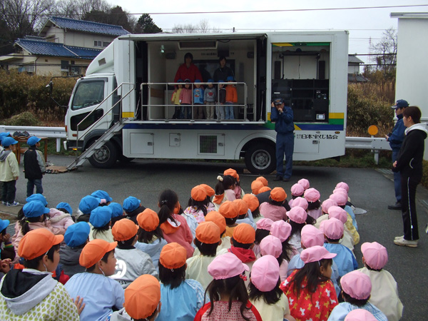 地震教室を行いました。消防士さんに地震の怖さや、正しい避難の仕方を学んだ後、起震車に乗りました。震度2・5・7の揺れを体験しました!「本当に起こったら恐いなぁ・・・」という感想も聞かれました。