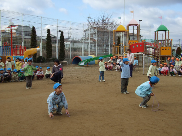 なわとび大会をしました!秋からがんばってきたなわとび。小さいクラスのお友だちは、長縄遊びを披露しました。ひまわりぐみ1位のお友だちは、なんと200回を超す大記録!!先生たちも顔負け・・・のがんばりでした。