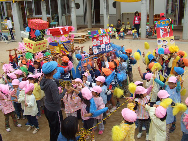 それぞれのグループ・クラスで作った太鼓のお披露目をしました。「よいやさぁ!どんどドン」と大きなかけ声とともに、練り歩く姿は大人顔負けです。祇園囃子も上手にうたえるようになりました。