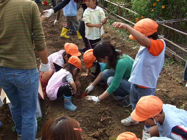 みんなでつるを植え、育てたさつまいもの収穫を行いました。この夏の暑さのせいか、例年に比べると芋の育ちが良くなかったんですが、大きなお芋が土から顔を出すと「わぁ〜!!」と歓声をあげる子どもたち。今度は焼き芋にしておいしくいただこうね。