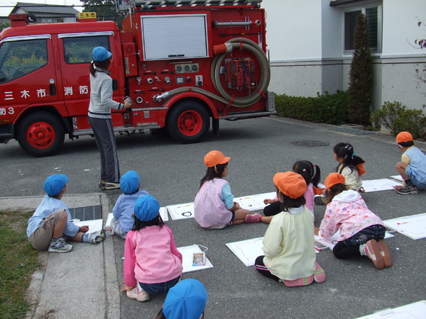 保育園に消防車がやってきました!!消防車の登場に小さいクラスのお友だちは大興奮(^o^)大きいクラスのお友だちは消防車をじっくり眺めて、画用紙いっぱいに消防車を描いていました。
