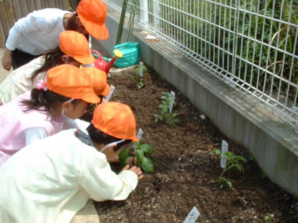 ひまわりぐみのみんなで野菜の苗を植えました。園庭の花壇を小さな畑にして、ひとつひとつ丁寧に植えていきました。ミニトマト・ピーマン・おくら・きゅうりの4種類の苗を植えました。夏にはおいしい野菜がたくさん実るといいね。