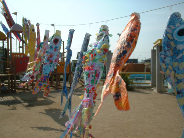 もも・すみれ・ひまわりぐみの子どもたちが作ったこいのぼりが園庭で泳いでいます。みんなで力を合わせてつくりあげました。それぞれいろいろな工夫がしてあります。じっくり見てくださいね。