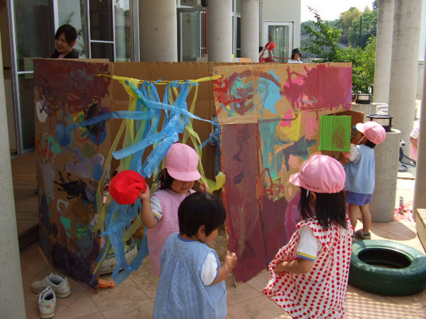 参観日の日にみんなで色を塗った壁を組み立てて、ももぐみの基地が完成しました。できあがった基地の中に入って大喜びの子どもたち☆わいわいはしゃいで遊んでいましたよ。