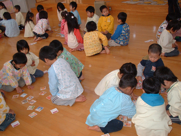 ももぐみ以上のお友だちが、遊戯室に集まってカルタ取り大会をしました。「はいっ!」「はいっ!」っと、元気な声が響き渡っていました。1枚でも多くとろうと必死でした。小さなお友だちもお部屋でカルタ取りを楽しんでいます。